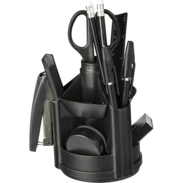 Настольный канцелярский набор Attache выполнен из пластика в черном цвете с прозрачными вставками.Отличное решение для рабочего стола. Подставка занимает минимум места и вмещает в себя все нужны канцелярские мелочи для работы. Имеет вращающуюся на 360 градусов основу.Комплектация: подставка, два карандаша с ластиком, две ручки, канцелярский нож, точилка, ластик, ножницы, линейка, степлер № 10, силовые кнопки, скобы для степлера № 10, скрепки. Всего 14 предметов.Поставляется в картонной коробке.