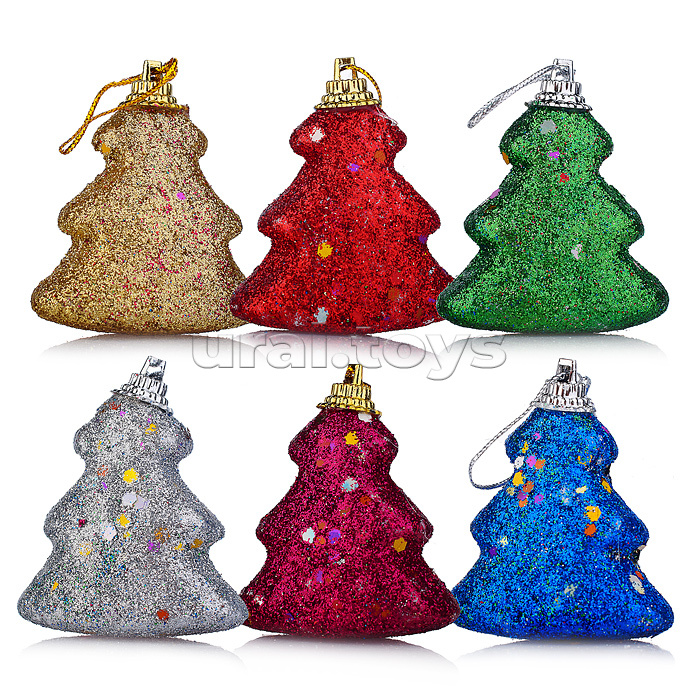 В комплекте шесть елочек. Размеры: 5 х 5,5 х 3 см. Материалы: пластмасса, полимерные материалы. Соответствует требованиям безопасности продукции.