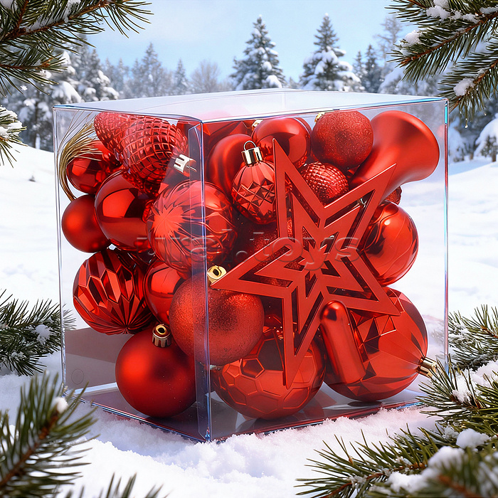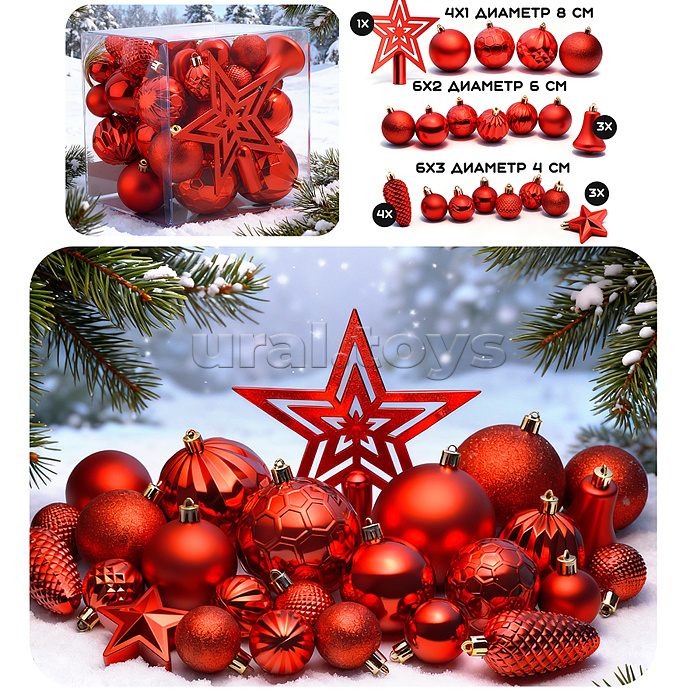 Код: 494275 Штрихкод: 6978459063287 Страна производитель: Китай Размеры упаковки: 20 x 17 x 20 см Количество в коробке: 12 • В наборе 45 новогодних украшений: - звезда (15,5х17 см.) - 4 шара (8 см.) - 6 шаров (6 см.) - 6 шаров (4 см.) - 3 звезды (6 см.) - 4 шишки (7 см.) - 3 колокольчка (6 см.) • Материалы: пластик. • Соответствует требованиям безопасности продукции. • Для детей от 3-х лет. Комментарии к товару