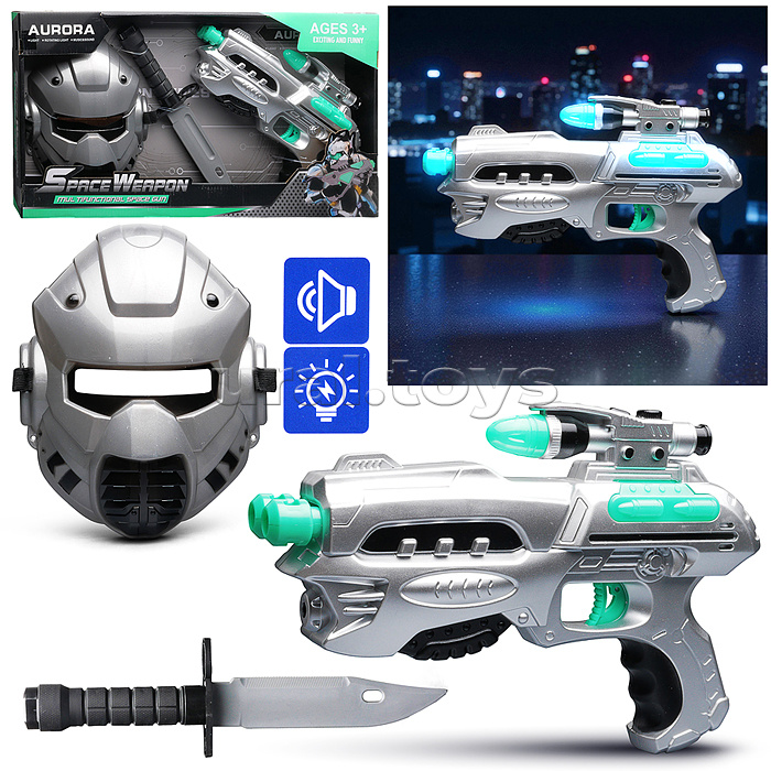 Код: 493088 Штрихкод: 6933112443837 Страна производитель: Китай Размеры упаковки: 6.5 x 48 x 25 см Количество в коробке: 18 • В наборе: - бластер (25х3.5х16 см.) - нож (7.5х2.5х27 см.) - маска (18х22см.) • Функции бластера: космические звуки выстрелов, подсветка корпуса. • Бластер работает от 3-х батареек "АА" (не входят в комплект). • Материал: пластик. • Соответствует требованиям безопасности продукции. • Для детей от 3-х лет. Комментарии к товару