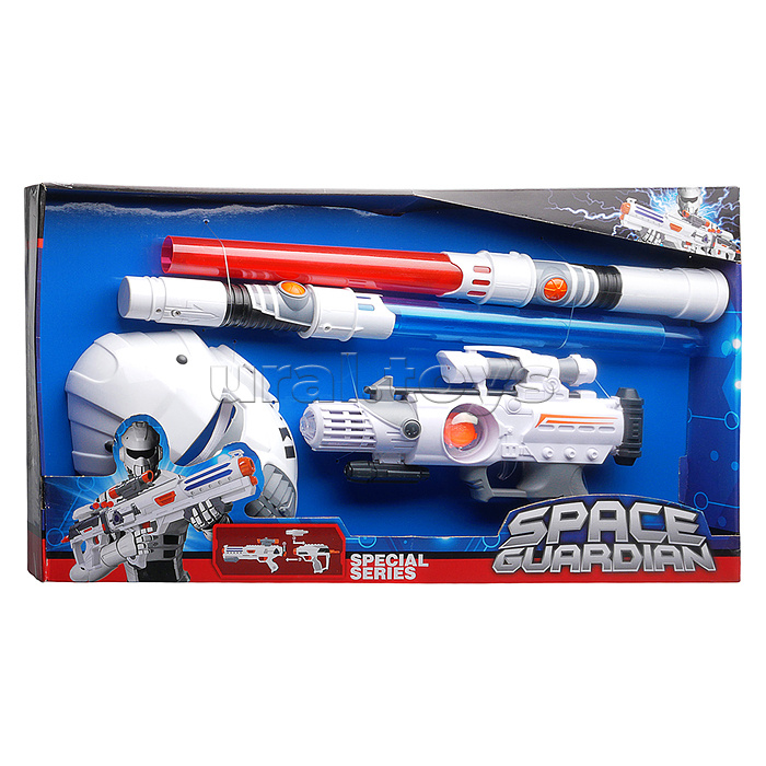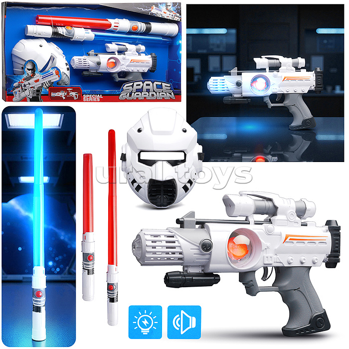 Код: 493098 Штрихкод: 6933112030723 Страна производитель: Китай Размеры упаковки: 5.5 x 57 x 32 см Количество в коробке: 12 • В наборе: - бластер (27х4х18 см.) - 2 световых меча с телескопическим лезвием (4х4х69 см.) - маска (18х22см.) • Функции бластера: космические звуки выстрелов, подсветка корпуса. • Бластер работает от 3-х батареек "АА" (не входят в комплект). • Функции меча: подсветка лезвия, космические звуки. • Мечи работают от 2-х батареек "АА" (не входят в комплект). • Материал: пластик. • Соответствует требованиям безопасности продукции. • Для детей от 3-х лет. Комментарии к товару