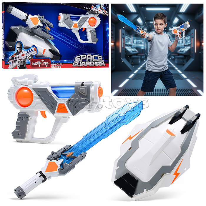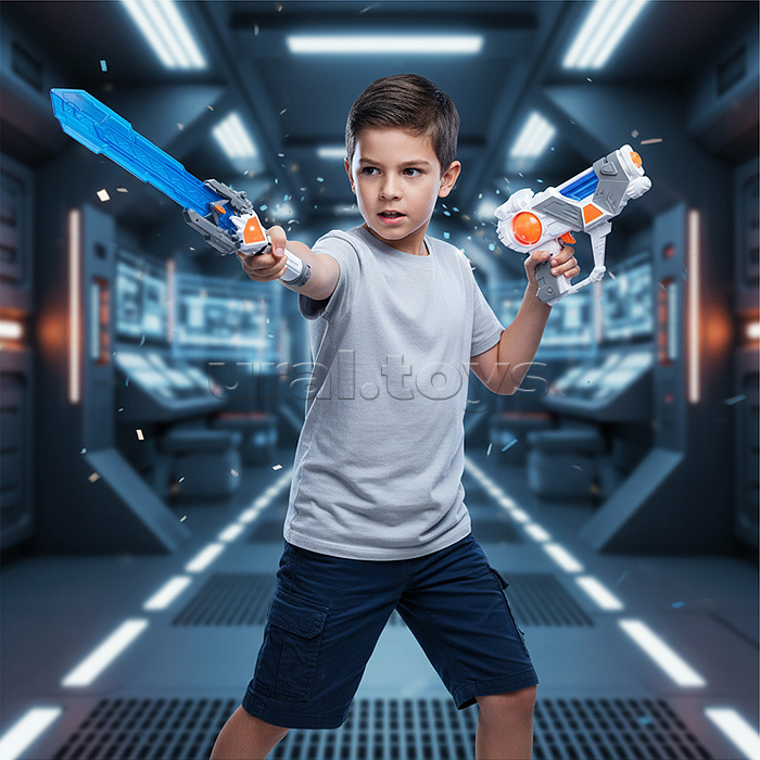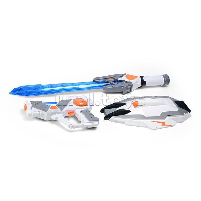 Код: 493097 Штрихкод: 6933112030730 Страна производитель: Китай Размеры упаковки: 57 x 5.5 x 31.5 см Количество в коробке: 12 • В наборе: - бластер (22.5х4.5х16 см.) - меч (9.5х4.5х60 см.) - щит (20х31.5 см.) • Функции бластера: космические звуки, подсветка корпуса. • Бластер работает от 3-х батареек "ААА" (не входят в комплект) • Функции меча: звуки ударов, подсветка лезвия. • Бластер работает от 3-х батареек "АА" (не входят в комплект) • Материал: пластик. • Соответствует требованиям безопасности и стандартам качества продукции. • Для детей от 3-х лет. Комментарии к товару