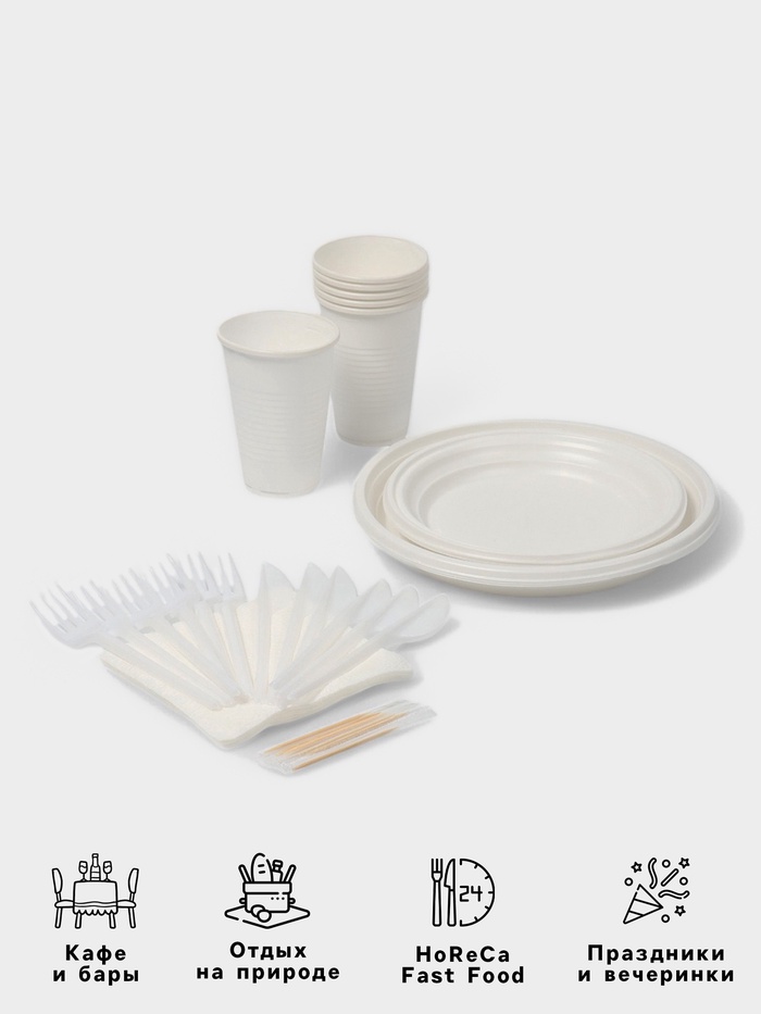 Этот набор одноразовой посуды сделает ваш отдых на природе максимально комфортным и беззаботным. Наслаждайтесь вкусной едой и приятной компанией! Выбирайте практичность и удобство! КомплектацияТарелка d=205 мм - 6 шт. Тарелка d=165 мм - 6 шт. Стаканы - 6 шт. Ножи - 6 шт. Вилки - 6 шт. Салфетки - 6 шт. Зубочистки - 6 шт. Комментарии к товару