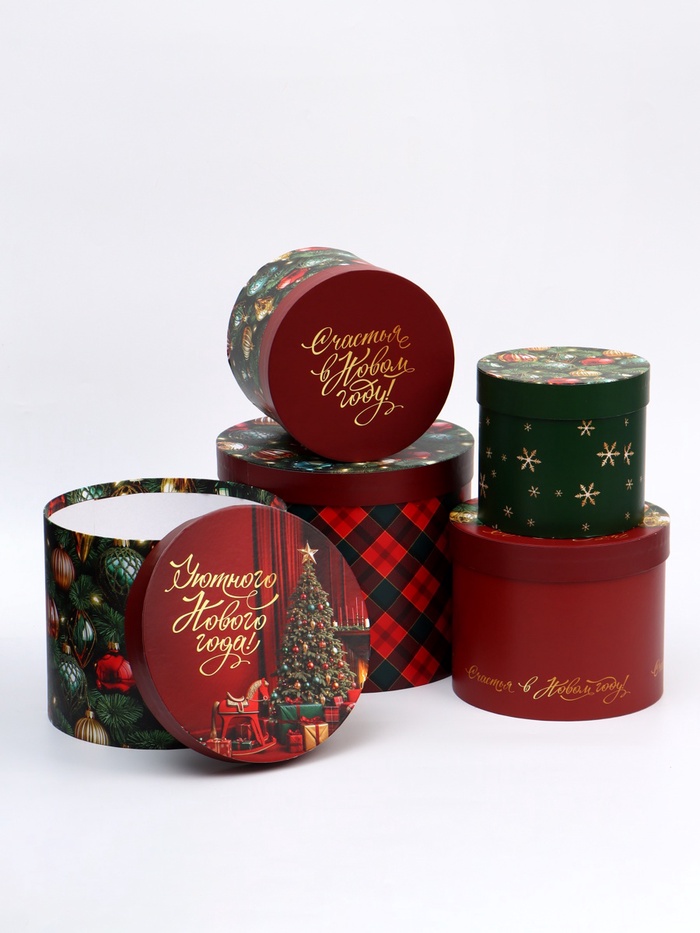 Габариты: 22,5 x 22,5 x 19,5 Страна: Россия В боксе: 12 набор Состав: Картон Материалы: картон Фасовка: по 1 набор Индивидуальная упаковка: Стрейч-пленка Сертификат: ЕАС Цвет: Бордовый, Зелёный Форма: Цилиндрическая, Круглая Плотность, г/м²: 1000 Количество вложений в наборе: 5 в 1 Высота большей коробки, см: 19,5 Длина большей коробки, см: 22 Ширина большей коробки, см: 22 Тематика: Новогодняя Символ года: Символ года 2026 (Лошадь) Тематика праздника: Новый год Размер: Средний (18-24 см) Дизайн: С рисунком, надписью Комментарии к товару