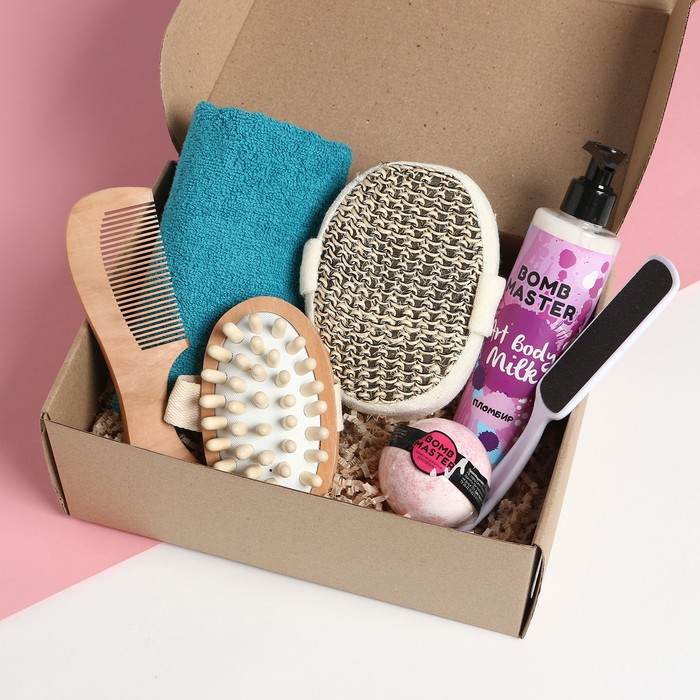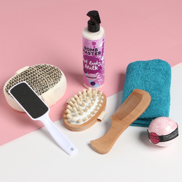 Составляющие набора: Полотенце, Тёрка для ног, Бомбочка для ванн, Мочалка, Молочко для тела, Расчёска для волос, Массажёр