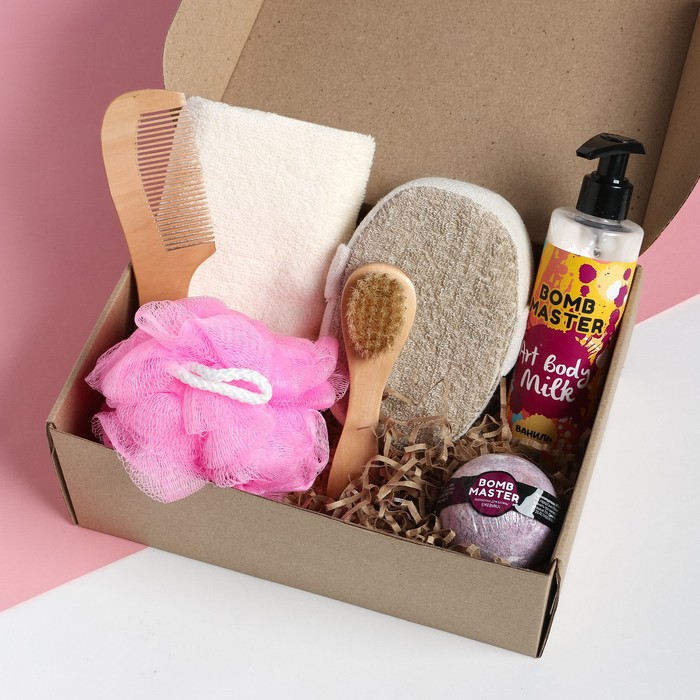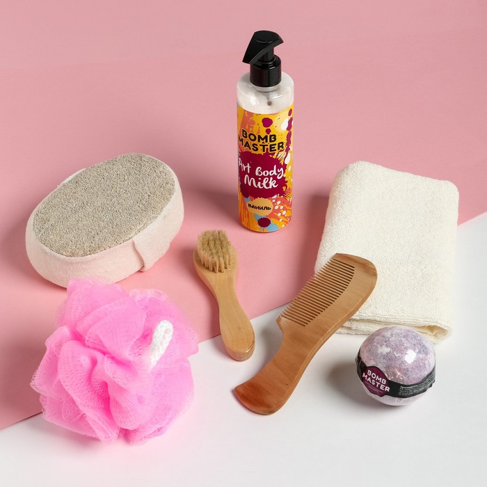 Составляющие набора: Полотенце, Мочалка, Бомбочка для ванн, Щётка, Молочко для тела, Расчёска для волос