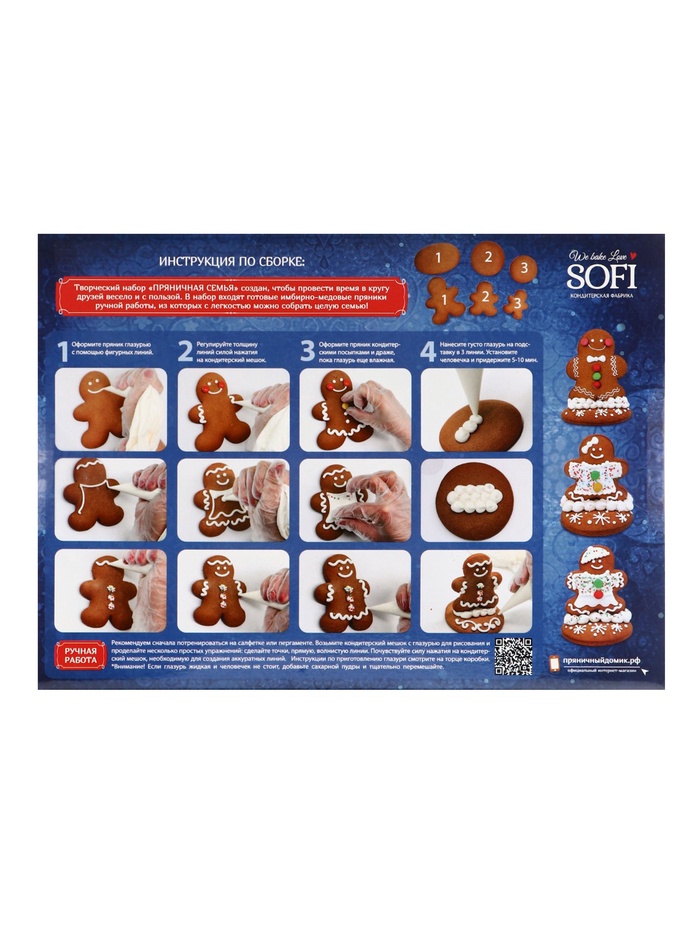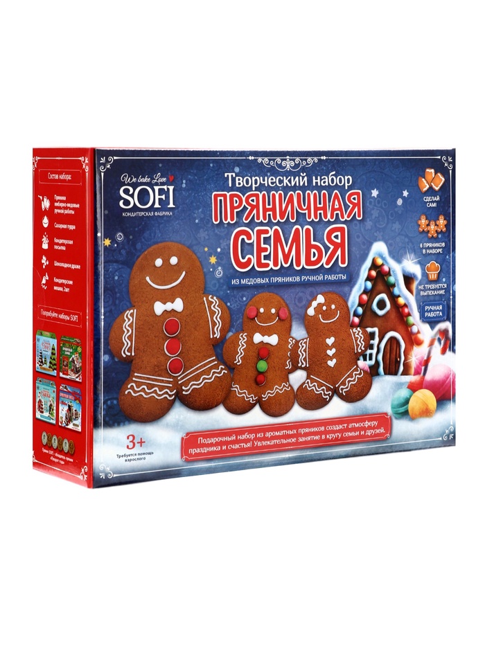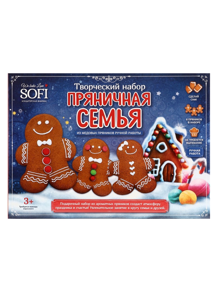 Габариты: 27 x 20,5 x 9,5 Страна: Россия В боксе: 6 шт Состав: См. на упаковке Материалы: см. на упаковке Фасовка: по 1 шт Индивидуальная упаковка: Без упаковки Сертификат: ЕАС В наборе, шт.: 12 Вес нетто, г: 900 Тематика: Новогодняя Вид упаковки: Коробка Символ года: Нет Тематика праздника: Рождество, Новый год Составляющие набора: Пудра, Кондитерский пакет, Посыпка, Пряник, Драже, Картинка Набор для творчества "Пряничная семья" предлагает вам уникальную возможность создать настоящие шедевры в мире кондитерского искусства. В состав набора входят имбирно-медовые пряники ручной работы, которые завораживают своим ароматом и вкусом. К ним прилагаются сахарная пудра для украшения, съедобные картинки с изображением пряничного домика, которые добавят вашим пряникам праздничного настроения. Также в набор включены кондитерская посыпка и шоколадное драже, которые позволят вам создать яркий и аппетитный дизайн, а кондитерские мешки облегчат процесс нанесения украшений. Создание пряничной семьи станет увлекательным занятием для всей семьи, подарив массу положительных эмоций и возможность проявить свою креативность. Пряники, изготовленные с использованием этого набора, не только будут радовать глаз, но и порадуют своим вкусом. Набор "Пряничная семья" идеально подходит для празднования Нового года или Рождества, а также для создания уникальных сладких угощений, которые станут отличным дополнением к вашим праздничным традициям. Комментарии к товару