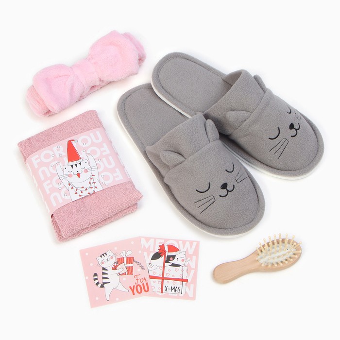 В подарочный набор входят: Тапочки (р. 38), Повязка, Расчёска, Полотенце, Открытка (2 шт.)