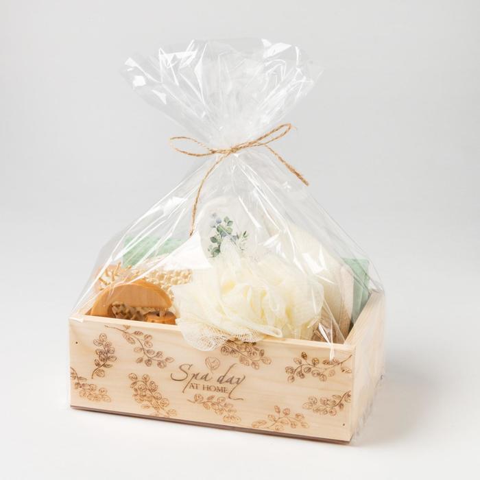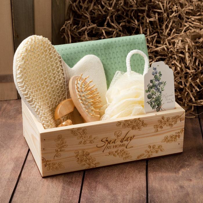 Составляющие набора: Варежка-мочалка, Массажёр, Расчёска для волос, Полотенце, Мочалка, Ящик