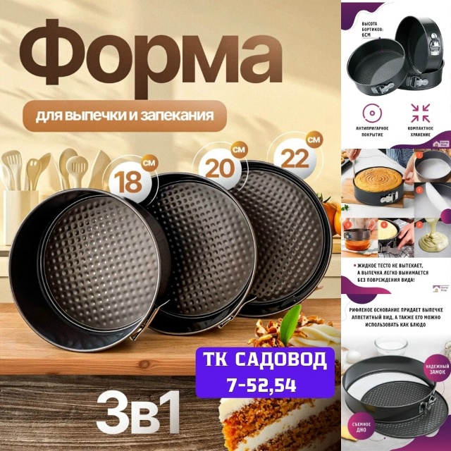 Набор из трех разъемных форм для выпечки: 18 см, 20 см, 22 см. Формы для запекания пригодятся на кухне для любой хозяйки: испечь торт, пирог, запеканку, кекс. Комплект состоит из металлических разъемных форм разных размеров. Разъемный механизм с зажимом и съемное дно помогут без труда достать пирог, а благодаря антипригарному покрытию блюдо не пригорит. Формы подходят под любой тип духовки, можно мыть в посудомоечной машине.