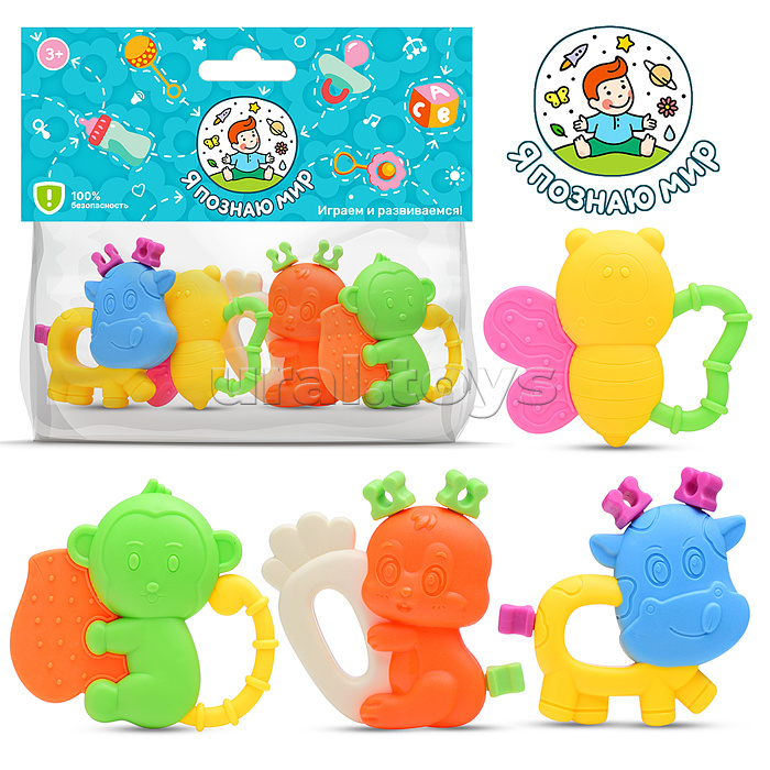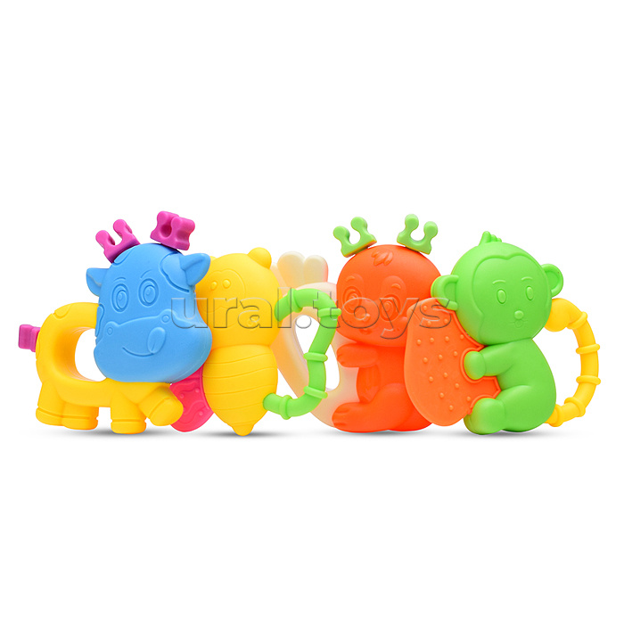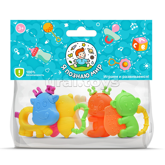 • В наборе 4 погремушки. • Размеры игрушки: 8.5х2.5х9 см. • Материал: пластик. • Соответствует требованиям безопасности продукции. • Для детей от 3-х лет.