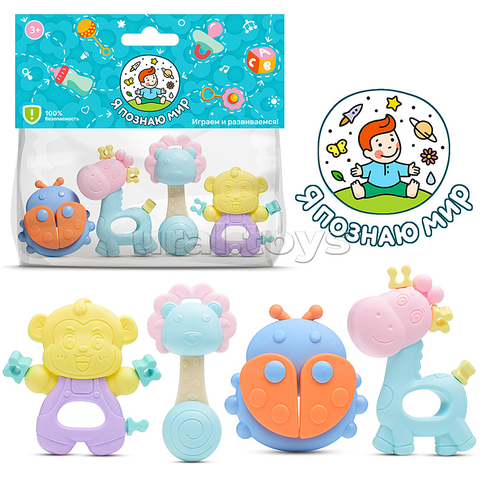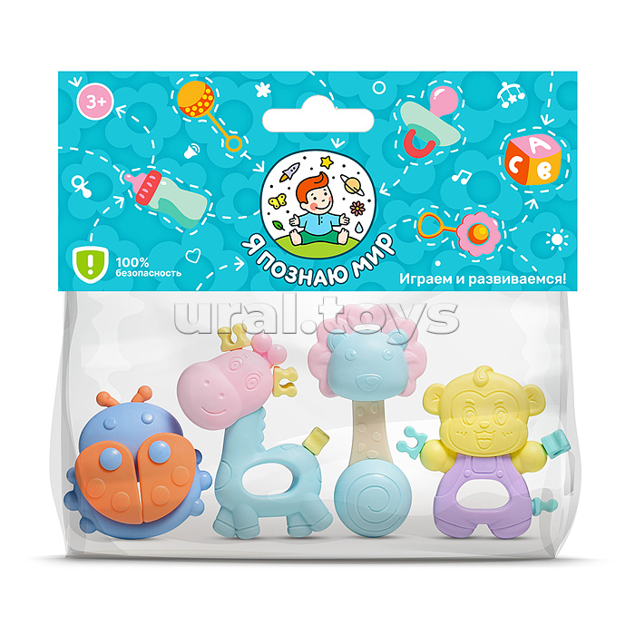 Код: 491403 Штрихкод: 4630432245432 Страна производитель: Китай Размеры упаковки: 17.5 x 6 x 17 см Количество в коробке: 90 • В наборе 4 погремушки. • Размеры погремушки: 8х2.5х8.5 см. • Материал: пластик. • Соответствует требованиям безопасности продукции. • Для детей от 3-х лет. Комментарии к товару