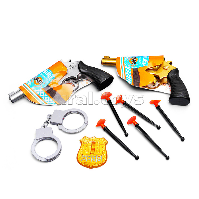 Код: 493546 Штрихкод: 6933118065958 Страна производитель: Китай Размеры упаковки: 17 x 21 x 4 см Количество в коробке: 168 • В наборе: - 2 пистолета с пружинным механизмом (16х2х9 см.) - 5 пластиковых пуль с присосками. - полицейский жетон. - наручники. • Материалы: пластик. • Соответствует требованиям безопасности и стандартам качества продукции. • Для детей от 3-х лет. Комментарии к товару