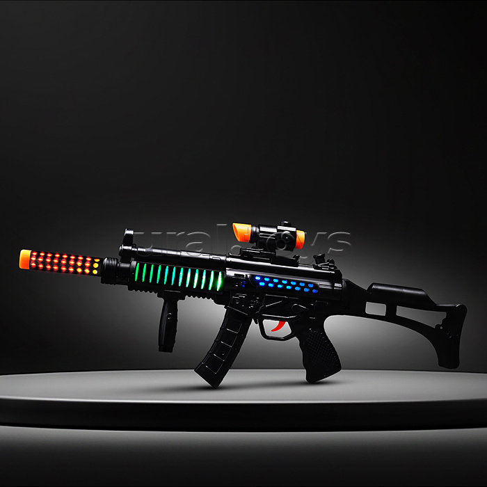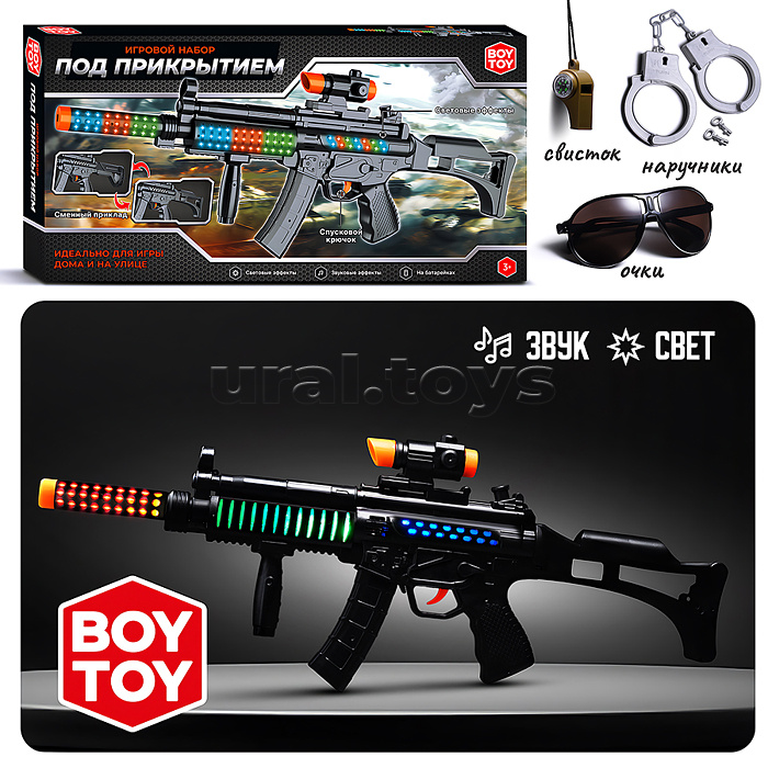 • В наборе: - автомат (61х3.5х24 см.) - тёмные очки. - свисток. - наручники. • Функции автомата: - звуки выстрелов и взрывов. - подсветка корпуса. • Для работы нужны 3 батарейки "АА" (не входят в комплект) • Материал: пластик. • Соответствует требованиям безопасности продукции. • Для детей от 3-х лет.