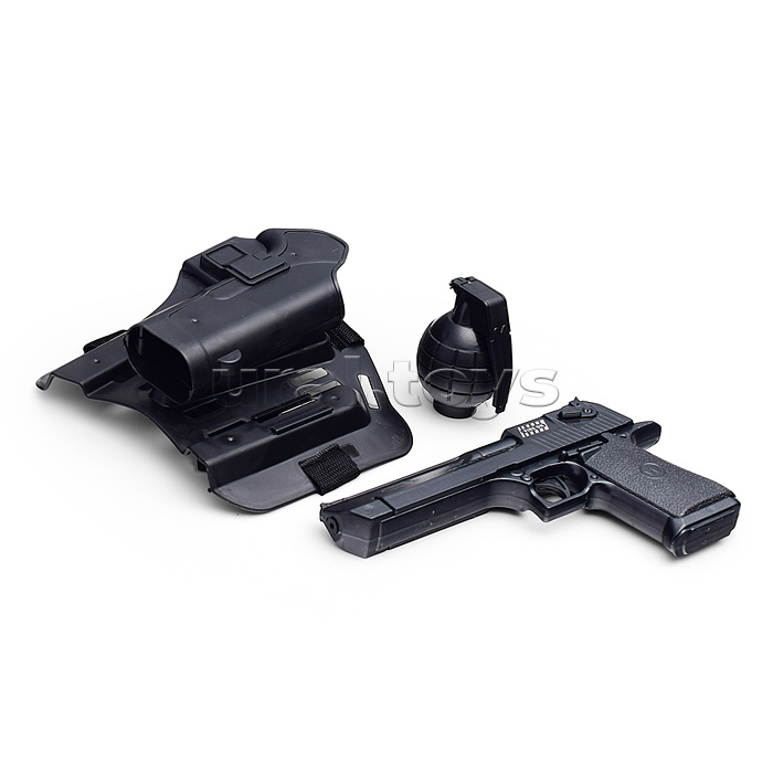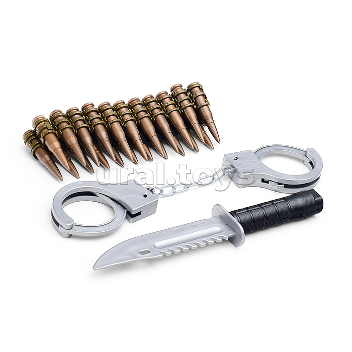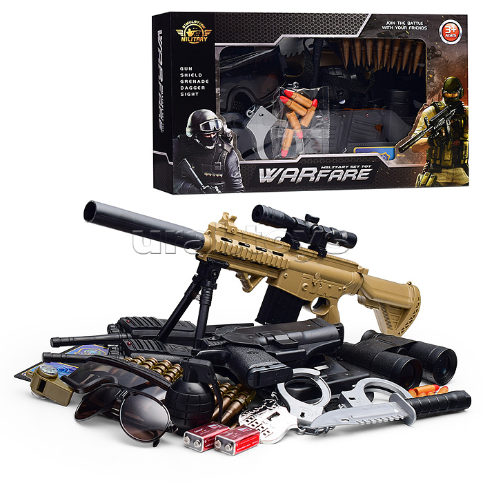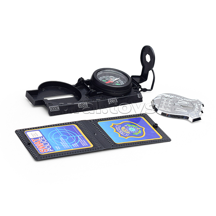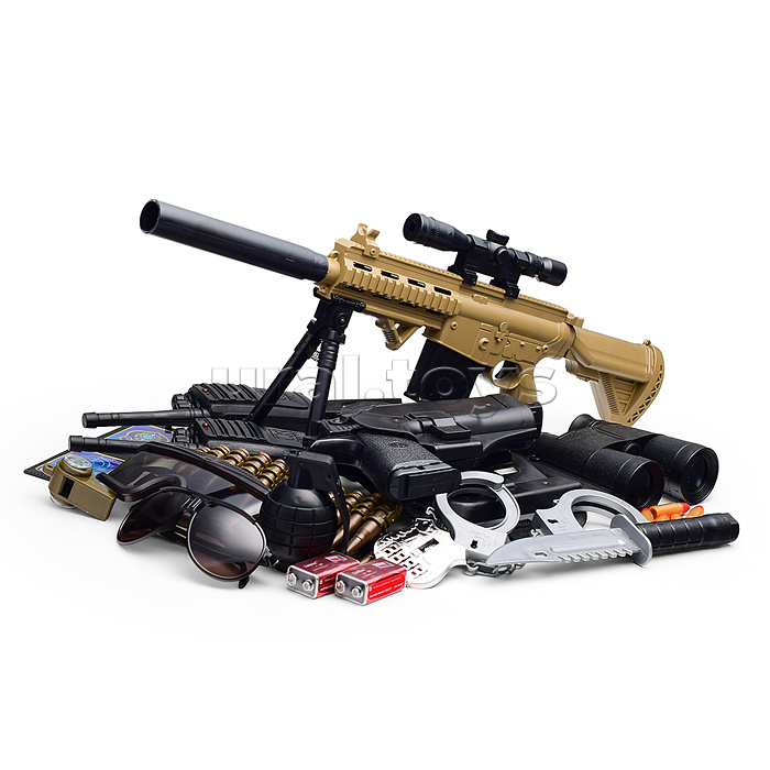 • В наборе: - винтовка с пружинным механизмом стрельбы (68х11х19 см.) - 10 пуль с резиновым наконечником (1х1х3.5 см.) - пистолет с щёлкающим затвором (22х3х12 см.) - нож (4.5х2х22.5 см.) - компас. - наручники. - защитные очки. - полицейский жетон. - свисток. - бинокль. - граната (6х5х8 см.) - 2 рации. • Функции гранаты: звуки отсчёта и взрыва, мигает красная лампочка. • Граната работает от 2-х батареек "LR1130" (входят в комплект для демонстрации) • Рация работает от 1 батарейки "6F22" (2 батарейки в комплекте) • Материал: пластик. • Соответствует требованиям безопасности продукции. • Для детей от 3-х лет.