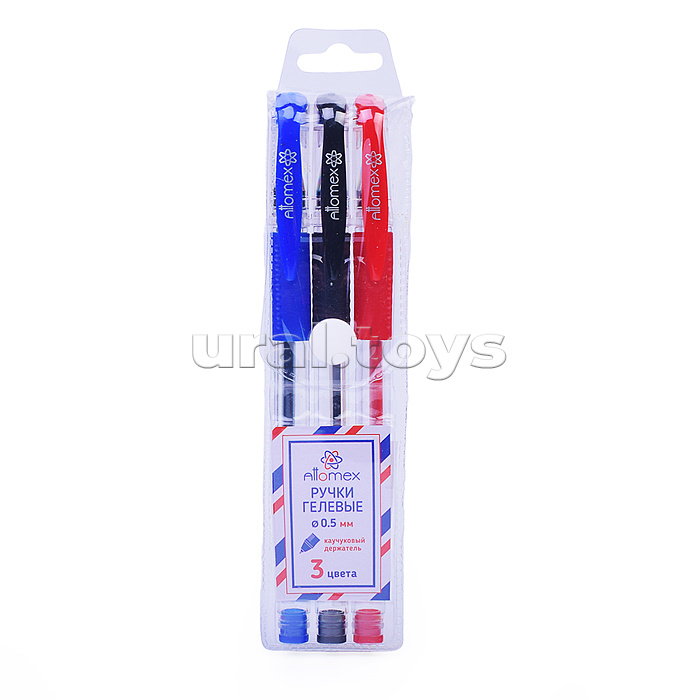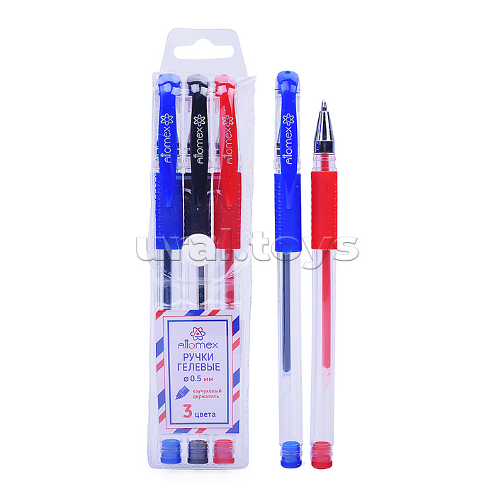Набор ручек гелевых "Attomex" 03 стандартных цвета, d=0,5 мм, прозрачный корпус с металлическим наконечником и каучуковым держателем, сменный стержень, в пластиковом блистере