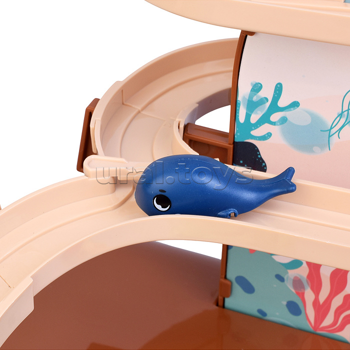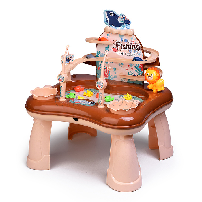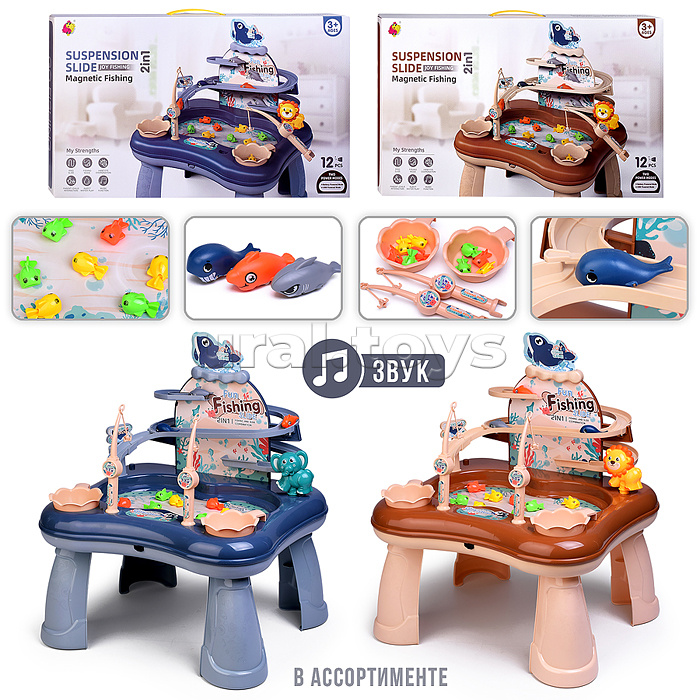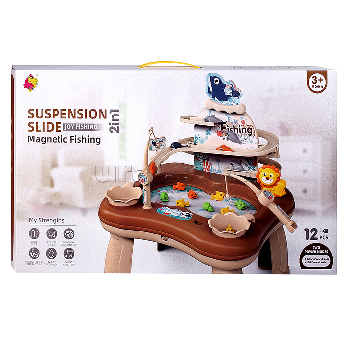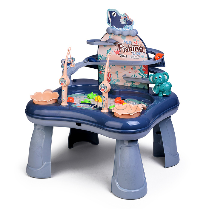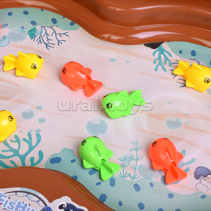• В наборе: - стол с бассейном (35х30х42 см.) - 2 удочки с крючком. - 9 рыбок с металлическим элементом (2.5х2х1.5 см.) - 3 акулы с металлическими роликами (3.5х1.5х1.5 см.) - 3 корзины (7.5х7.5х2.5 см.) - USB-шнур. • Функции: - при помощи магнитов рыбки плавют по дну бассейна. - при помощи роликов акулы съезжают с горки и попадают в бассейн. - весёлая мелодия (отключается). • Работает от USB или от 3-х батареек "АА" (не входят в комплект) • Материал: пластик. • Соответствует требованиям безопасности продукции. • Для детей от 3-х лет.