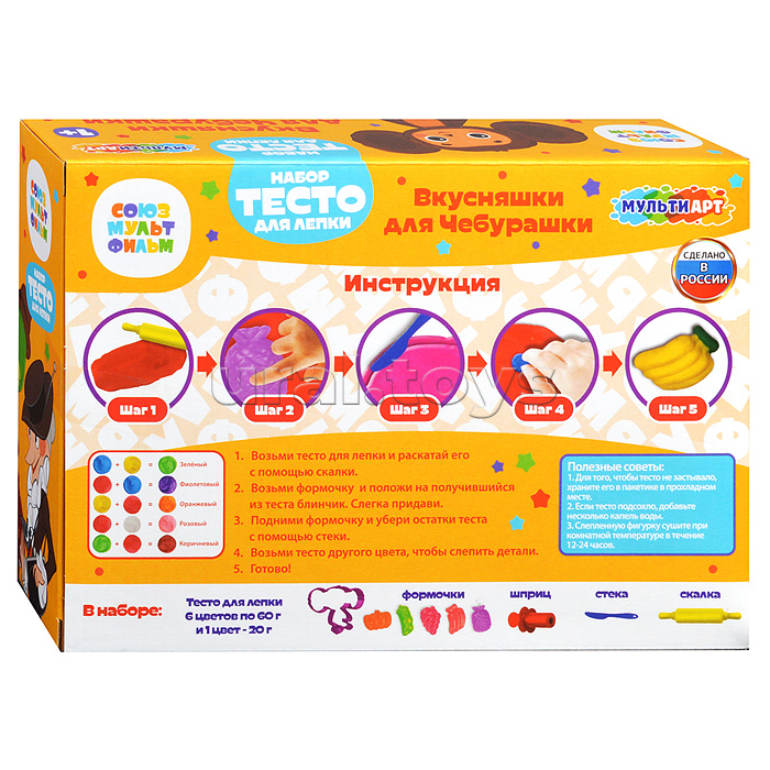 Код: 466024 Штрихкод: 4650250595700 Страна производитель: Россия Размеры упаковки: 6 x 24 x 17 см Количество в коробке: 8 В наборе: - тесто по 60гр. 6 цветов. - тесто по 20 гр. 1 цвет. - формочки. - шприц. - стека. - скалка. Соответствует требованиям безопасности продукции. Для детей от 1 года. Комментарии к товару
