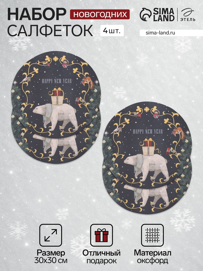 Габариты: 30 x 30 x 0,2 Страна: Россия В боксе: 75 набор Состав: Полиэстер 100% Материалы: полиэстер Фасовка: по 1 набор Сертификат: ЕАС Набор: Да Цвет: Чёрный Форма: Круглая Плотность, г/м²: 420 Размер, см: 30 х 30 В наборе, шт.: 4 Сезон: Зима Тематика: Новогодняя Вид упаковки: Пакет Рисунок: Да Символ года: Нет Тематика праздника: Новый год Материал: Оксфорд Декоративные элементы: Без элементов Рекомендации по уходу: Глажка при 150 °С, Стирка при 40 °С, Не отбеливать, Деликатный режим отжима Состав ткани: Полиэстер В подарочной упаковке: Нет Особенности: Без особенностей Фактурные: Нет Фиксированная цена: Да Комментарии к товару