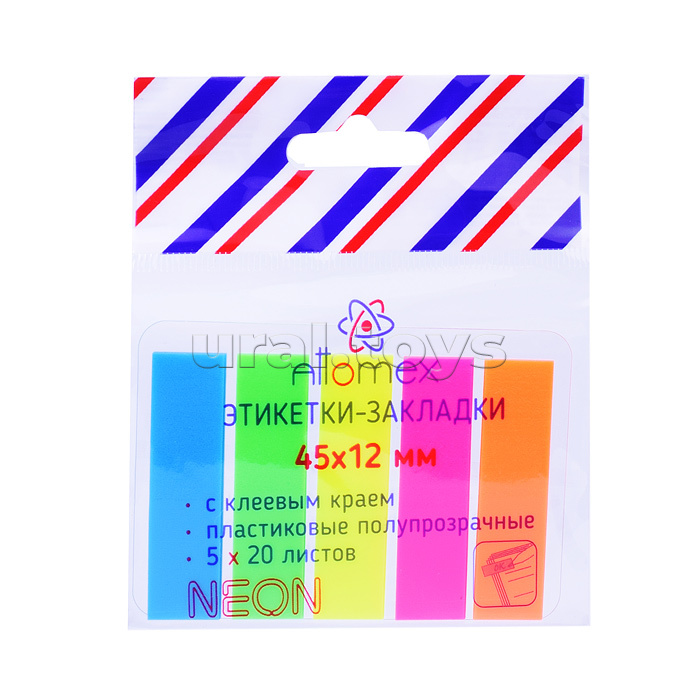 Набор самоклеящихся этикеток-закладок "Attomex" пластиковые полупрозрачные 45x12 мм, 5x20 листов, 5 неоновых цветов, в пластиковом пакете с европодвесом