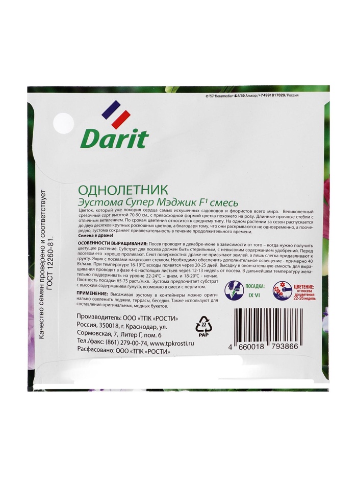 Производитель: Мой выбор Габариты: 13 x 12 x 0,4 Страна: Россия В боксе: 50 набор Состав: Семена Материалы: семена Фасовка: по 1 набор Индивидуальная упаковка: Пакет (БОПП, полиэтилен, ПВХ, дой-пак) Габариты товара: 17 см × 9 см × 1 см Сертификат: Не подлежит сертификации