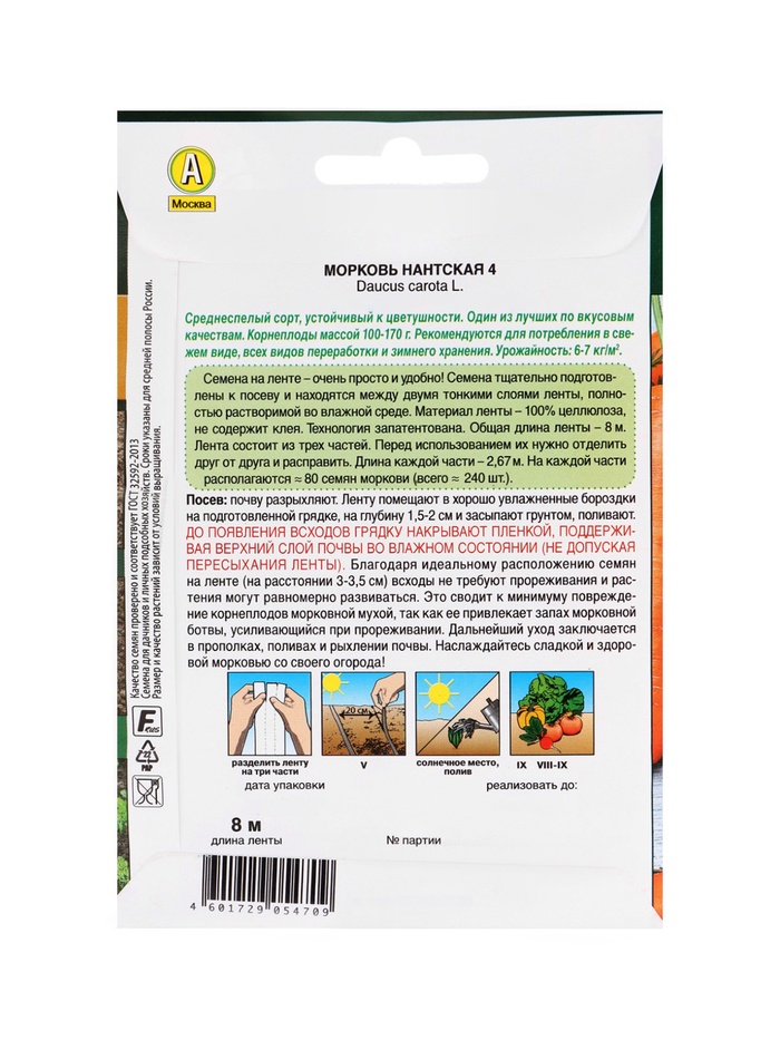 Габариты: 15 x 10 x 0,5 Страна: Россия В боксе: 300 шт Состав: Семена Материалы: семена Фасовка: по 1 шт Индивидуальная упаковка: Пакет (БОПП, полиэтилен, ПВХ, дой-пак) Габариты товара: 17 см × 15 см × 5 см Сертификат: Не подлежит сертификации Сроки созревания: Средний Посев на рассаду: Апрель, Май Место выращивания: Открытый грунт Сорт или гибрид: Сорт Цвет плода: Оранжевый Вид: На ленте Комментарии к товару