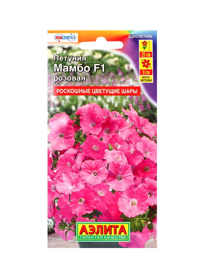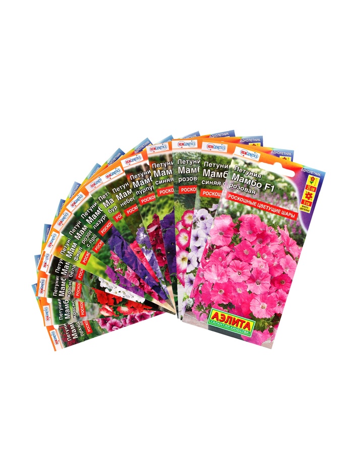 - 14 ярких сортов в одном наборе: внутри вас ждет настоящая цветовая феерия! 14 различных сортов петунии «Мамбо» с самой разнообразной окраской - от классических белых, розовых и красных до насыщенных фиолетовых, пурпурных и даже полосатых. Вы сможете создать уникальные, многогранные композиции.