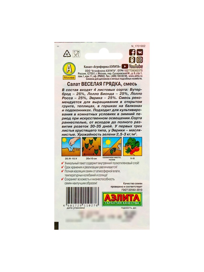 Набор семян Салат "Веселая грядка" листовой, смесь, 5 шт.