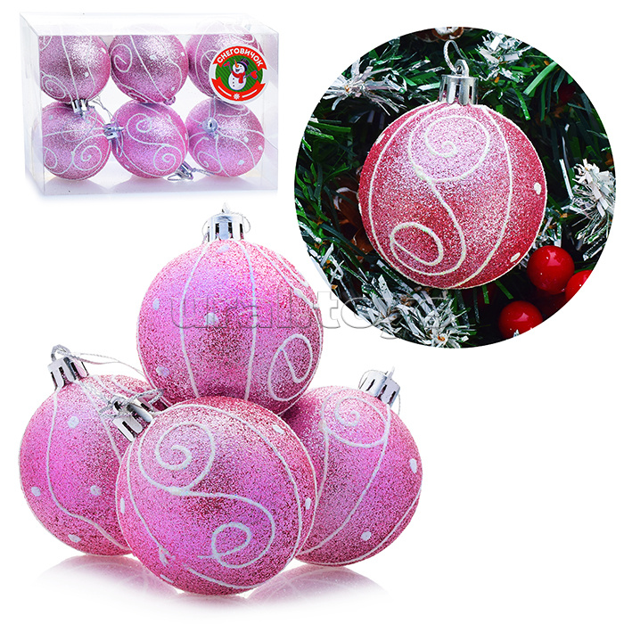 Код: 341035 Страна производитель: Китай Размеры упаковки: 18 x 12 x 6 см Количество в коробке: 120 • В наборе 6 новогодних шаров с подвесом. • Цвет: розовый (блёстки). • Диаметр шара: 6 см. • Изготовлено из полимерных материалов, пластика. • Соответствует требованиям безопасности продукции. • Возраст: 14+ Комментарии к товару