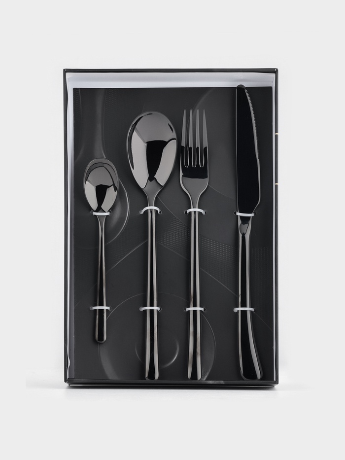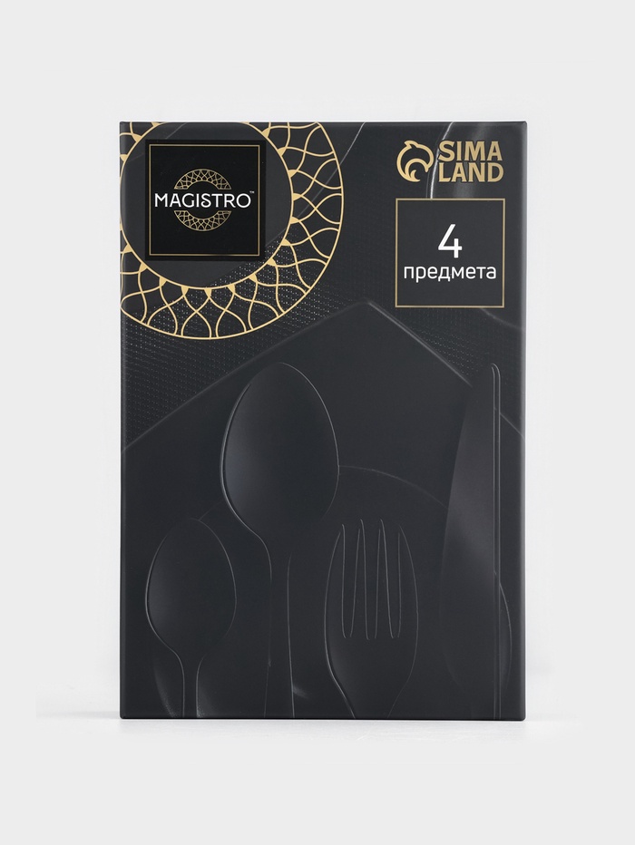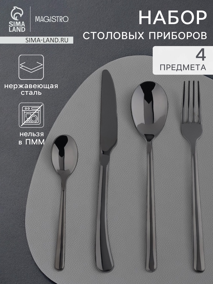 Габариты: 26 x 17,5 x 4 Страна: Китай В боксе: 24 набор Состав: Нержавеющая сталь Материалы: нержавеющая сталь Фасовка: по 1 набор Индивидуальная упаковка: Картонная коробка Габариты товара: 27 см × 16 см × 4,2 см Сертификат: СТР Набор: Да Цвет: Чёрный Количество персон: 1 В наборе, шт.: 4 Материал ручки: Нержавеющая сталь Вид упаковки: Коробка картонная Рисунок: Нет Материал: Нержавеющая сталь Для детей до 3 лет: Нет Назначение: Столовые Можно мыть в посудомоечной машине: Нет Цвет ручки: Чёрный Состав набора: Нож столовый, Ложка столовая, Ложка чайная, Вилка столовая Матовая поверхность: Нет Внешний вид: Без особенностей Фиксированная цена: Да Столовые приборы Magistro «Джентри» имеют простую утонченную форму с четкими линиями и глянцевую полировку. Будь то повседневная или праздничная сервировка, они будут смотреться уместно. Все предметы из набора идеально сбалансированы и эргономичны, их удобно держать в руках и приятно пользоваться. Тщательно отполированная поверхность приборов будет сохранять мягкий блеск даже при ежедневном использовании. Не подходят для мытья в посудомоечной машине. Комплектация1. Ложка столовая - 1 шт; 2. Вилка столовая - 1 шт; 3. Нож столовый - 1 шт; 4. Ложка чайная - 1 шт. Комментарии к товару