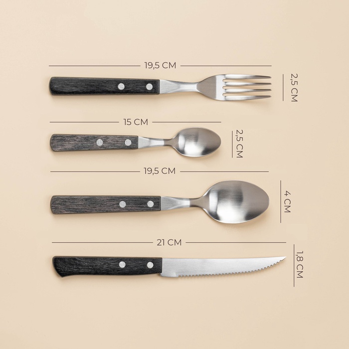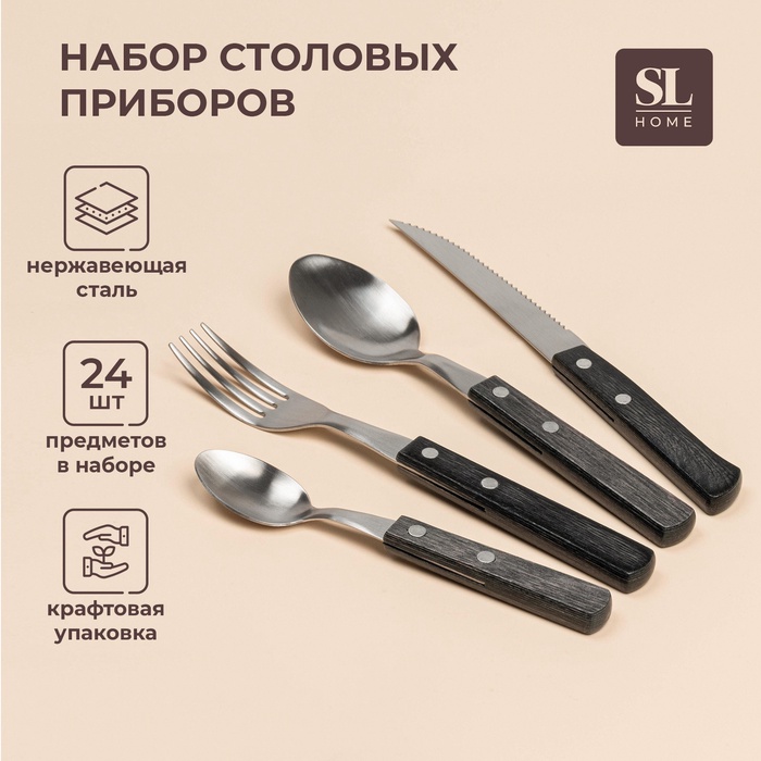 Габариты: 28 x 16,5 x 8 Страна: Китай В боксе: 20 набор Состав: Дерево, нержавеющая сталь Материалы: дерево, нержавеющая сталь Фасовка: по 1 набор Индивидуальная упаковка: Картонная коробка Габариты товара: 26 см × 18 см × 4 см Сертификат: СТР Набор: Да Цвет: Серебристый Количество персон: 6 В наборе, шт.: 24 Материал ручки: Дерево Вид упаковки: PVC-коробка, Коробка картонная с PVC Рисунок: Нет Материал: Нержавеющая сталь Можно мыть в посудомоечной машине: Нет Цвет ручки: Коричневый Состав набора: Ложка столовая, Ложка чайная, Вилка столовая, Нож столовый Матовая поверхность: Нет Внешний вид: Без особенностей Фиксированная цена: Да Набор столовых приборов SL Home — это изысканный комплект из 24 предметов, который станет настоящим украшением вашего стола. Столовые приборы изготовлены из высококачественной нержавеющей стали, устойчивой к коррозии, и имеют элегантное серебристое покрытие. Ручки приборов выполнены в коричневом цвете, что придаёт им особую изысканность и шарм. Все предметы отличаются высоким качеством изготовления и удобством использования. Столовые приборы идеально подходят для сервировки стола и станут прекрасным дополнением к любому интерьеру. Преимущества товара: