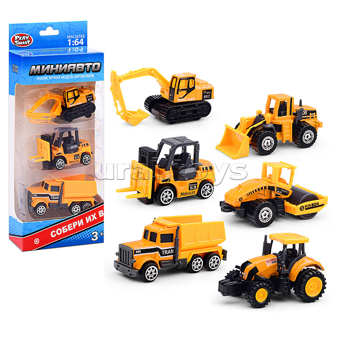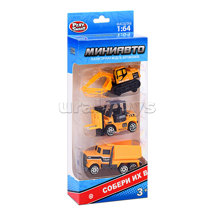 • В наборе 3 модели строительной техники. • Размеры модельки: 7х3 см. • Материалы: пластик, металл. • Соответствует требованиям безопасности продукции. • Для детей от 3-х лет.