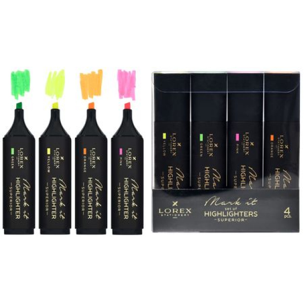 Текстмаркеры LOREX Mark it серии NEON – это четыре ярких неоновых цвета в стильном корпусе, выполненного по технологии Ultra soft touch в абсолютно черном оформлении с фольгой цвета золота. Подходят для выделения в тексте, ежедневнике, тетради. Сделают акценты на самые важные моменты. Заглушка колпачка каждого маркера соответствует цвету чернил. Прочный наконечник не западает в корпус и сохраняет форму на протяжении всего срока службы маркера. Скошенный пишущий узел позволяет наносить линии толщиной от 1 до 5 мм.