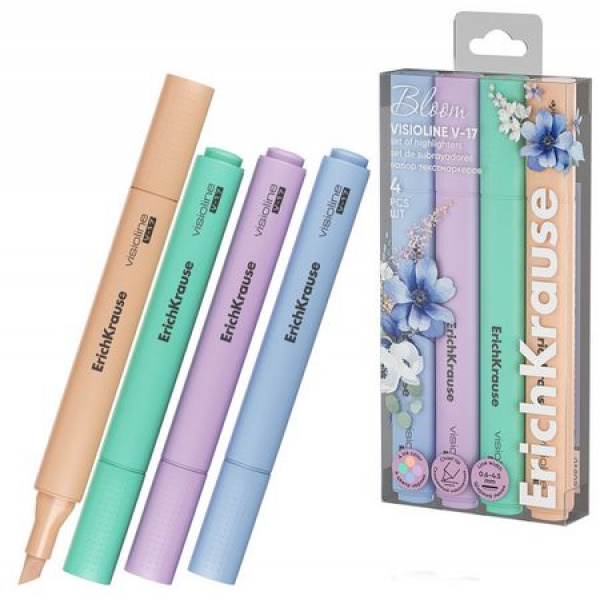 Набор из 4 текстмаркеров ErichKrause Visioline V-17 Pastel Bloom, цвет чернил: зеленый, персиковый, голубой, фиолетовый (в пэт-боксе)