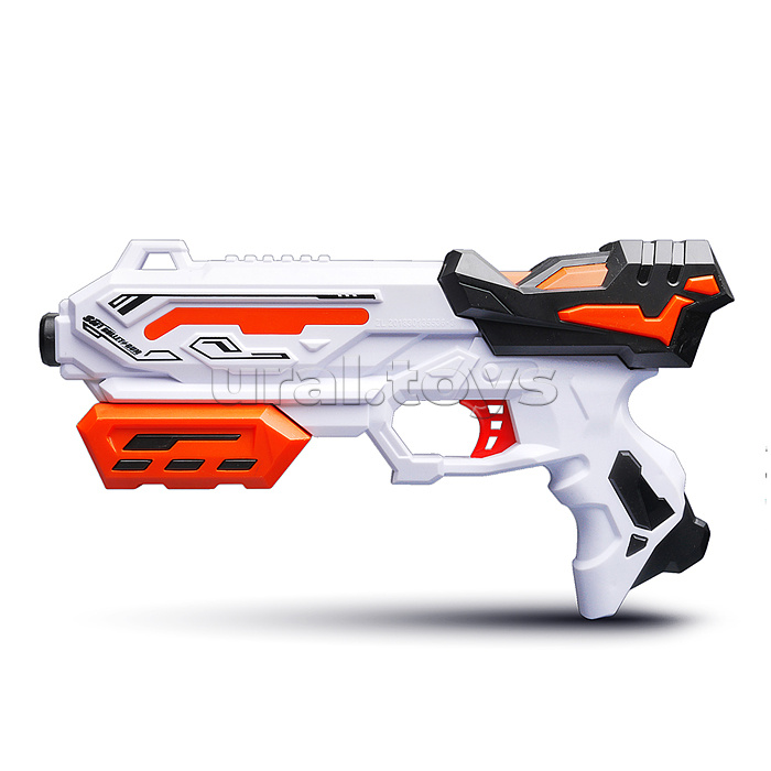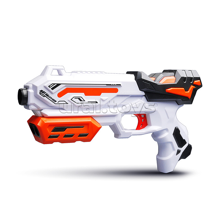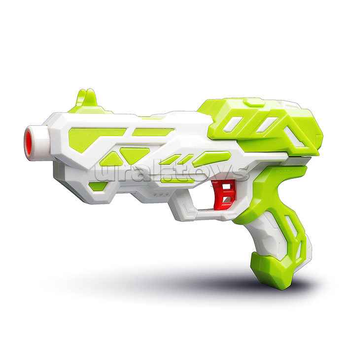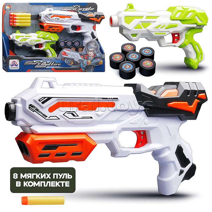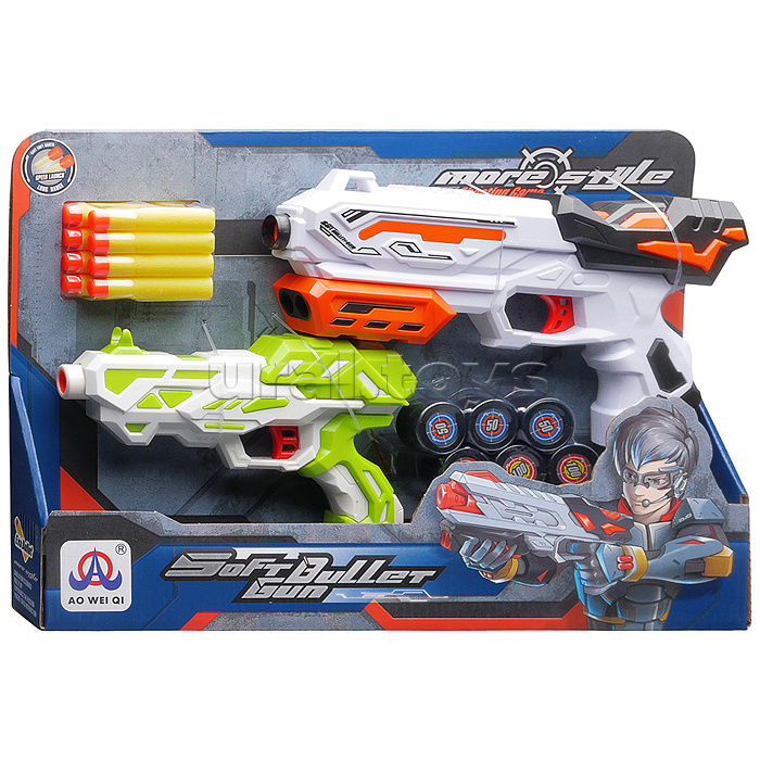 В наборе: - 2 пистолета с пневматическим механизмом (20х3.5х14 см.; 24х4х14 см.) - 8 мягких пуль с резиновым наконечником. - 6 мишеней (3х3х2 см.) Материал: пластик. Соответствует требованиям безопасности продукции. Для детей от 3 лет.
