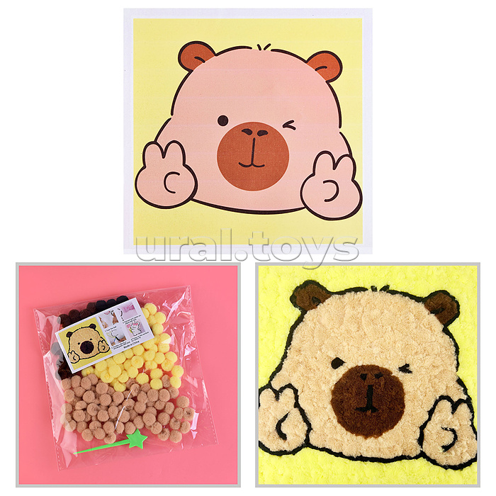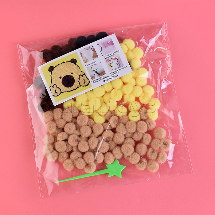 В наборе: - картонная основа 22х22 см. - разноцветные помпоны. Материал: полимерный материал, пластик. Соответствует требованиям безопасности продукции. Для детей от 5 лет.