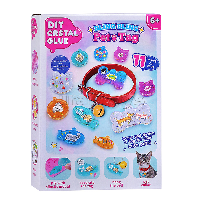 В наборе: - силиконовая форма. - силикон А1. - силикон В1. - пинцет 1 шт. - глиттер 3 цвета. - цепочка для повешивания 8 шт. - ошейник 1 шт. - листы наклеек 1 шт. - мерный стаканчик 3 шт. - палочка для замешивания 1. - инструкция. Соответствует требованиям безопасности продукции. Для детей от 6 лет.