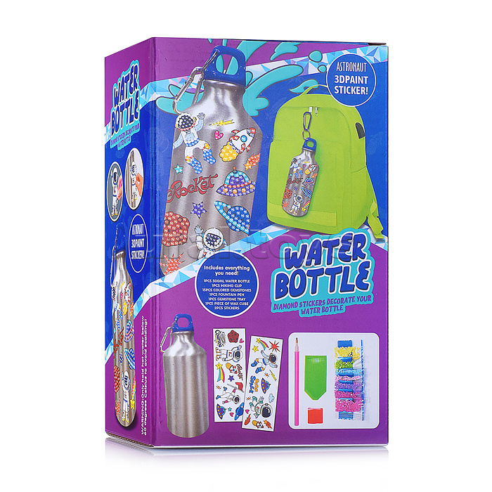 Код: 495758 Штрихкод: 6904111599559 Страна производитель: Китай Размеры упаковки: 20 x 12 x 8 см Количество в коробке: 48 В наборе: - бутылка для воды. - стразы. - картина с клеевой основой. - лоток. - стилус. - клеевая подушечка. - стразы. - наклейки. Соответствует требованиям безопасности продукции. Для детей от 6 лет. Комментарии к товару