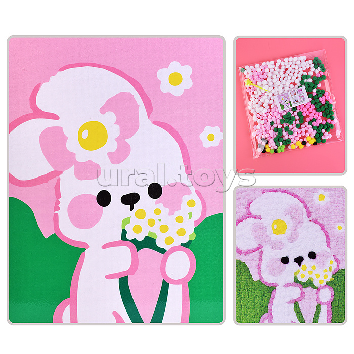 В наборе: - картина на деревянном подрамнике (30х40 см.) - разноцветные помпоны. Картина с липким слоем для наклеивания помпонов. Соответствует требованиям безопасности продукции. Для детей от 3-х лет.