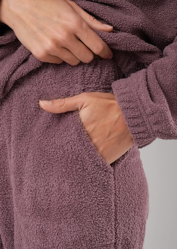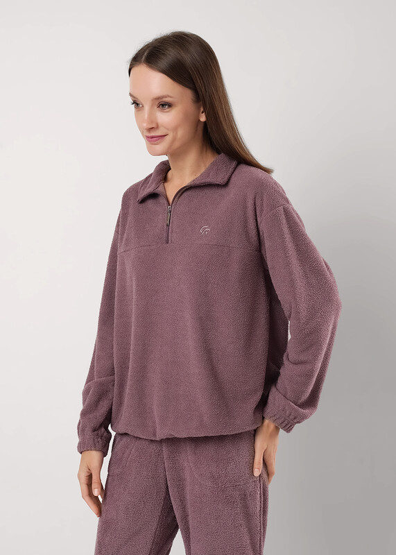 Женский костюм из велсофта ""барашек"", состоящий из джемпера и брюк. Джемпер с воротником стойка на молнии, на детали переда фирменная вышивка. По низу изделия и рукавов резинка. Брюки с боковыми карманами, по низу брюк резинка.