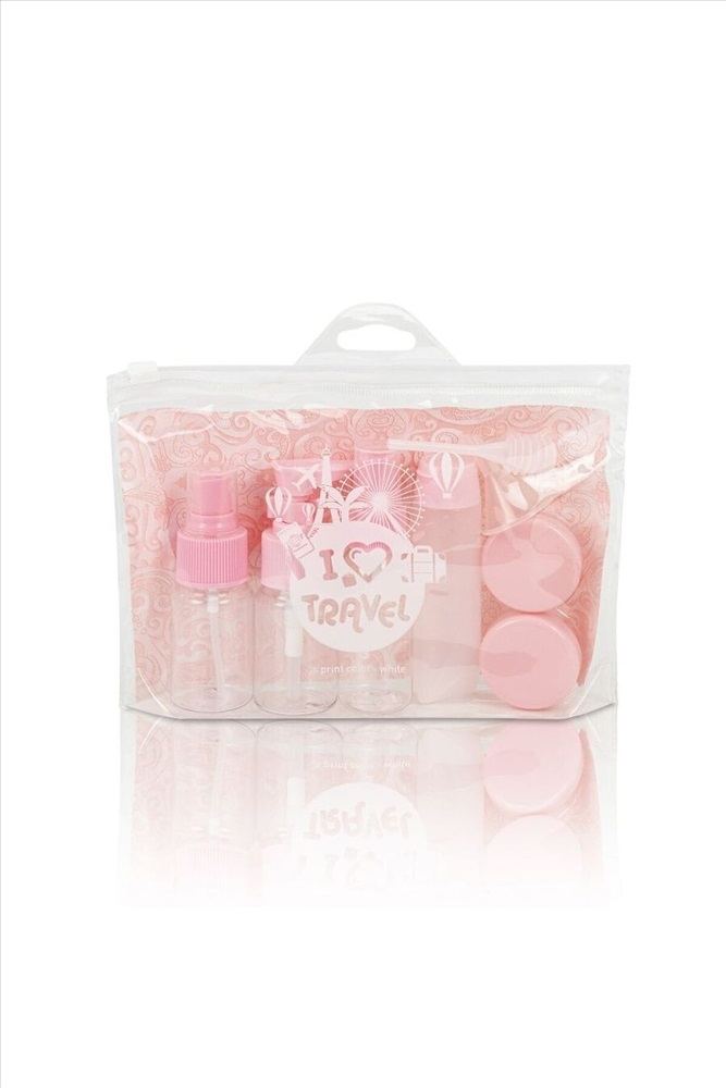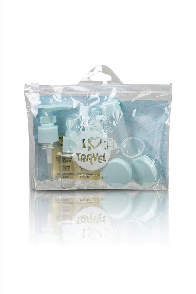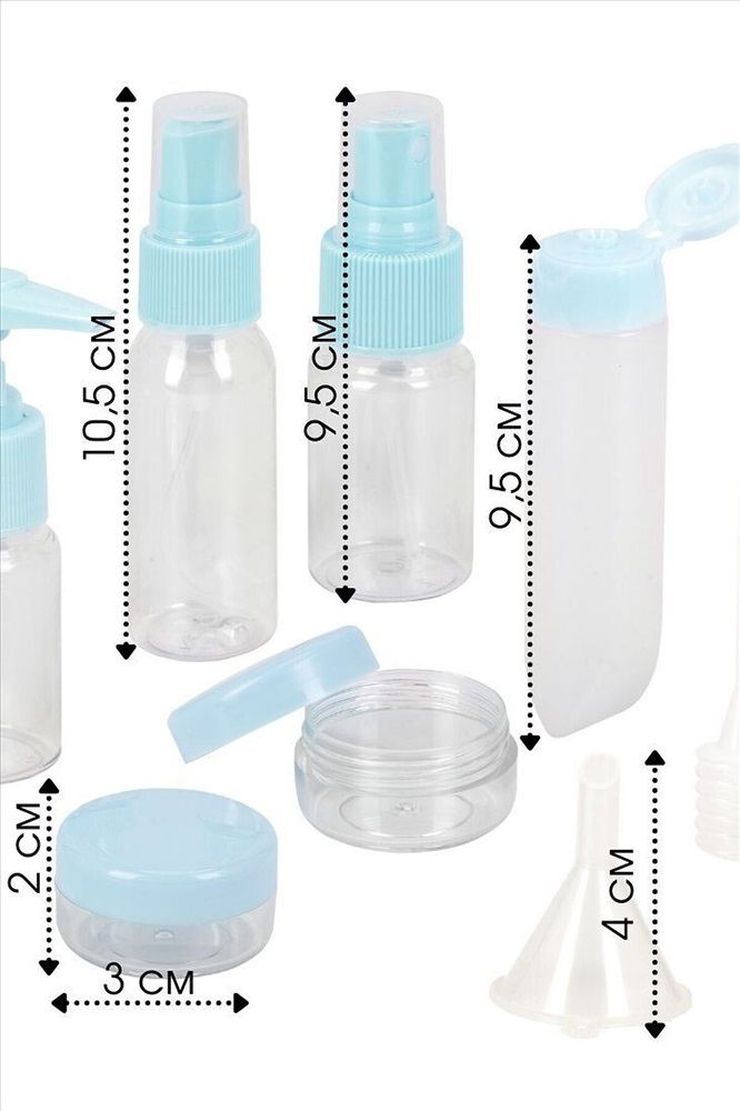 Набор дорожных косметических флаконов из 9 предметов в косметичке. Незаменимая вещь для путешествий и командировок. Состав набора: флакон-спрей для жидкостей - 2 шт (большой, маленький); тюбик для кремовых текстур - 1 шт; флакон с насос-дозатором и фиксатором - 1 шт; баночки - 2 шт; пипетка - 1 шт; лейка - 1 шт; ложечка - 1 шт; косметичка. Баночки выполнены из безопасного для здоровья пластика, который не вступает во взаимодействие с содержимым ёмкостей. Флаконы удобны в использовании и герметичны, благодаря небольшому формату занимают мало место в багаже. Упакованы в плотную косметичку с zip замком 19х13 см, которую удобно взять с собой и где ваши любимые средства всегда будут под рукой.