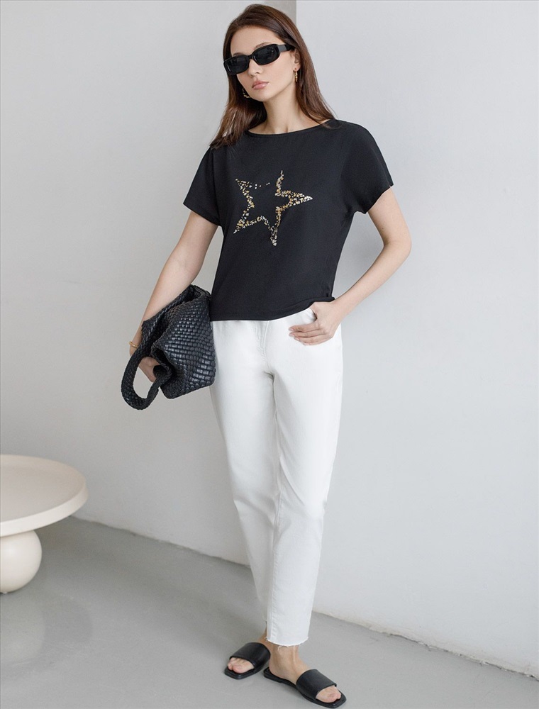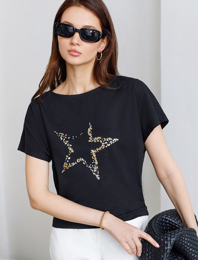 Футболка черного цвета идеально подходит для вечеринки и создания яркого образа. Оригинальный блестящий принт из фольги в виде звезды придает изделию шикарный вид, который привлечет внимание на любом мероприятии. Модель с вырезом лодочка и цельнокроеным рукавом обеспечивает свободу движений и комфорт в носке. Такой фасон изделия подходит на большие размеры, гармонично сидит на фигуре и помогает создать легкий акцент на достоинствах. Благодаря особенностям кроя с цельнокроеным рукавом удается искусно скроет любые возможные недостатки в области плеч и рук, обеспечивая комфортное прилегание без ощущения скованности. Аккуратный вырез лодочка красиво подчеркивает шею и делает образ элегантным, сохраняя актуальность для разных случаев — от рабочих встреч до вечерних прогулок и праздничных мероприятий.