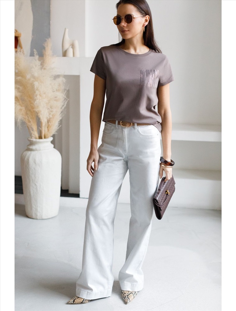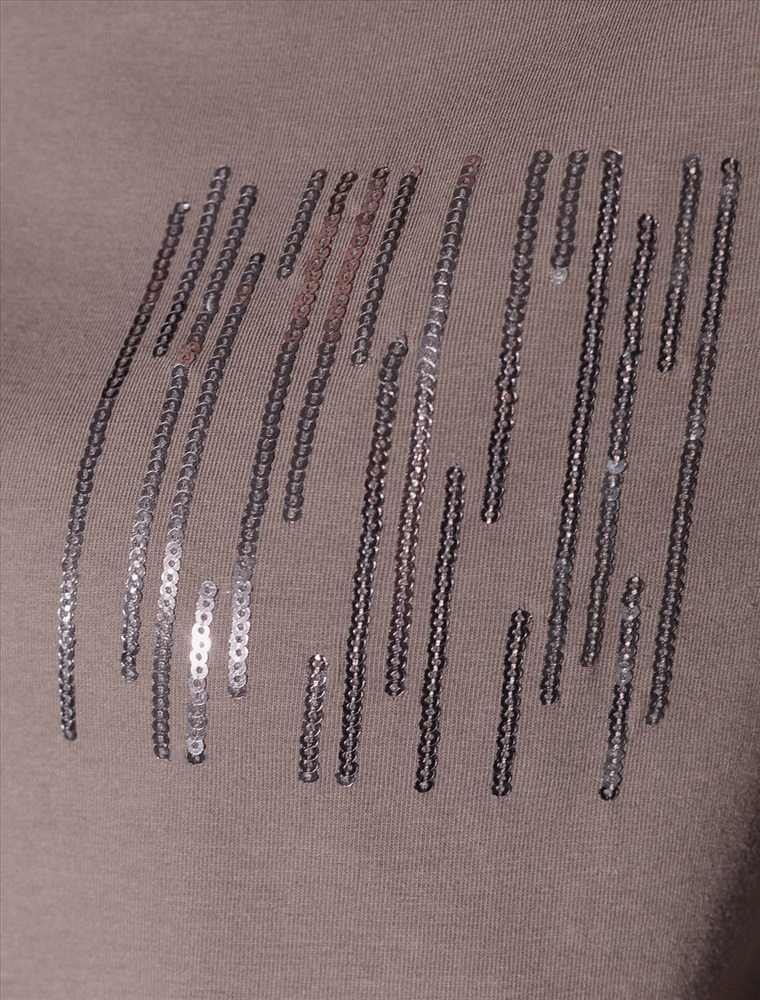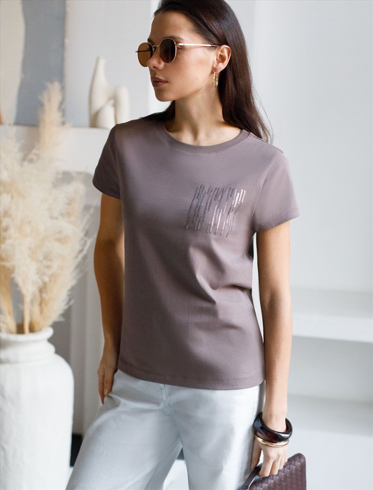 Футболка кофейного цвета идеально подходит для вечеринки и создания яркого образа. Оригинальный принт из серебристых пайеток придает изделию шикарный вид, который привлечет внимание на любом мероприятии. Модель с круглым вырезом и классическим коротким рукавом обеспечивает свободу движений и комфорт в носке. Такой фасон изделия подходит на большие размеры, гармонично сидит на фигуре и помогает создать легкий акцент на достоинствах.