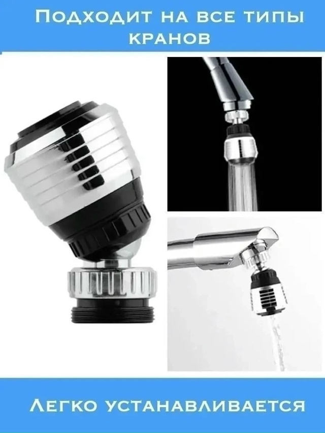 собой специальную насадку на кран для воды, экономящую расход воды. Данная сберегающая насадка на кран имеет 2-3 режима работы. Экономия воды происходит за счет того, что насадка на кран смешивает струю воды с воздухом, уменьшая таким образом объем воды, но сохраняя прежний напор. Миниатюрный аксессуар прекрасно подходит для стандартных типов кранов. Аэратор идеально подойдет для кранов на кухне, ванной комнате, экономит воду при мытье рук и посуды, снижает количество хлора за счет выветривания при аэрации и насыщает поток воды кислородом. Также, в карточке есть гибкий излив для смесителя с двухрежимным аэратором. Кран оснащен присоединительной гайкой 3/4" и аэратором, формирующим мягкую и ровную струю воды, а так же позволяющим экономить её расход. Длина излива: 55 см. Кран для кухни изготовлен из нержавеющей стали. Совместим с любыми импортными смесителями.