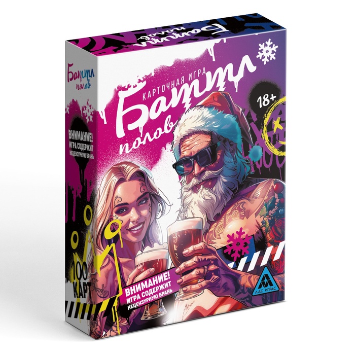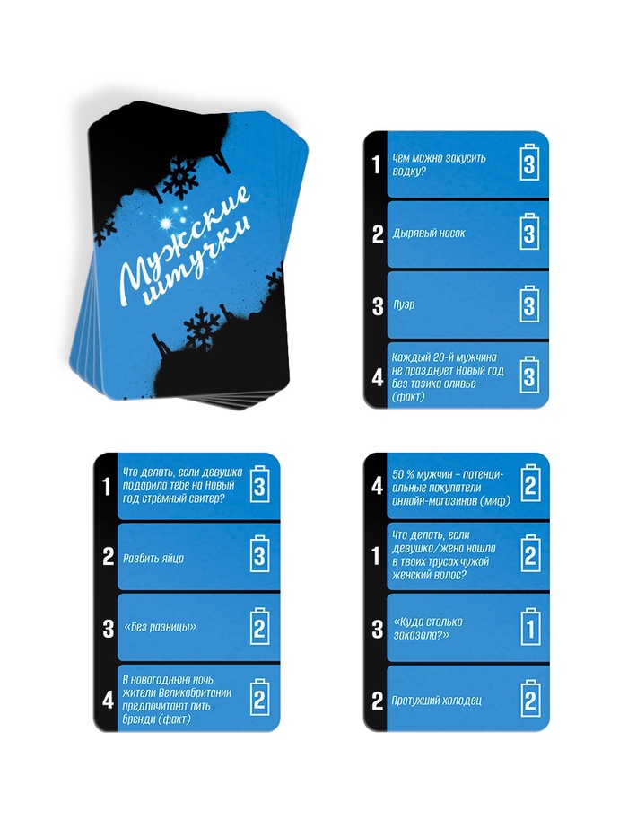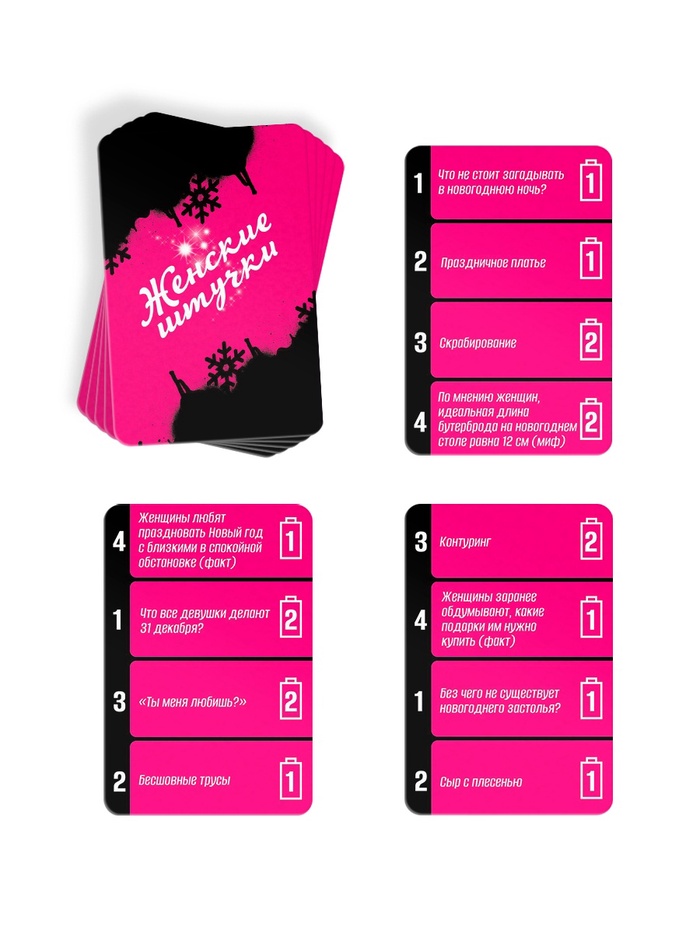 Габариты: 3,5 x 9,5 x 12,5 Страна: Китай В боксе: 80 шт Состав: Бумага, картон Материалы: бумага, картон Фасовка: по 1 шт Индивидуальная упаковка: Плёнка Сертификат: Не подлежит сертификации Для кого: Унисекс Возраст: От 18 лет Количество карт: 100 Символ года: Нет Тематика праздника: Новый год Возраст: Взрослый Материал: Бумага, Картон Количество игроков: От 4 игроков Время игры: 20 минут Жанр игры: Коммуникативная Повод для игры: Новый год, Вечеринка Количество игроков: 4 - 10 Фиксированная цена: Да Это не игра, а настоящее противостояние мужчин и женщин! Состав: