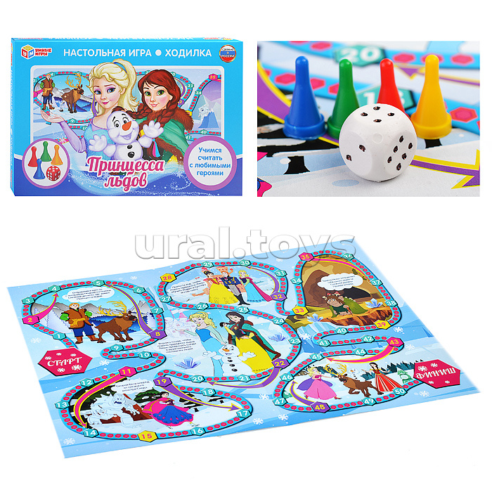 • Состав набора: – игровое поле (42×58 см); – 4 фишки; – кубик. • Материал: картон, пластмасса. • Для детей от 3-х лет.