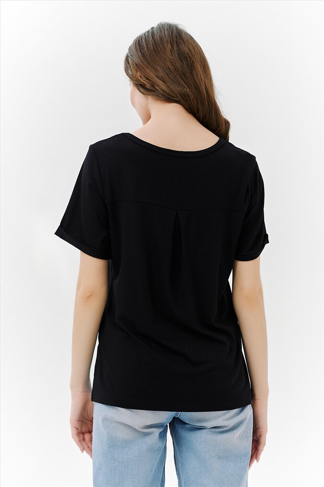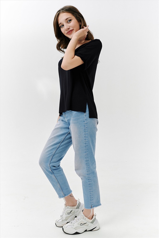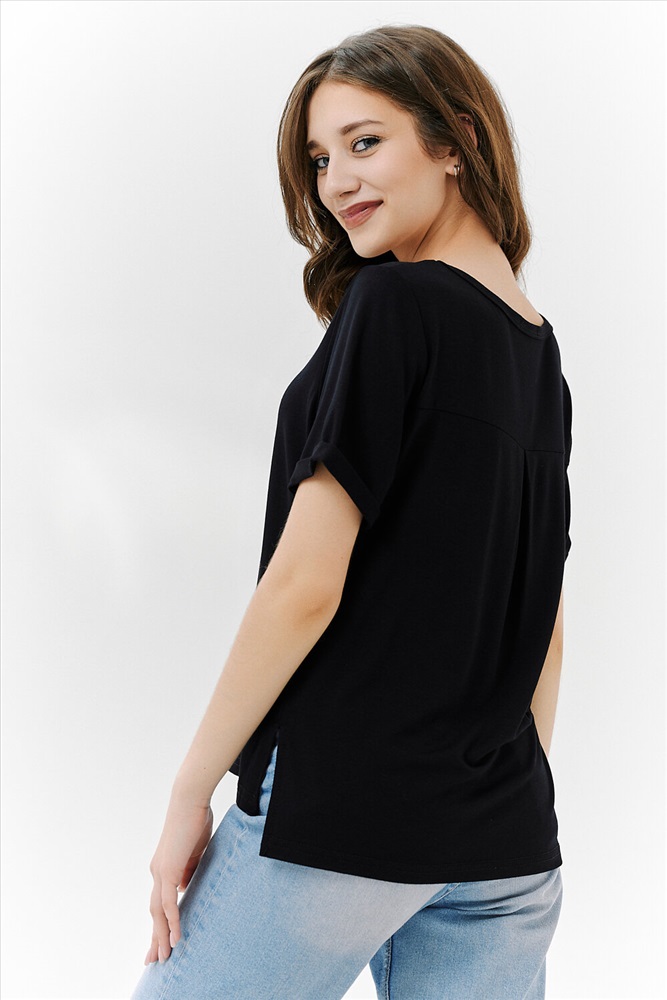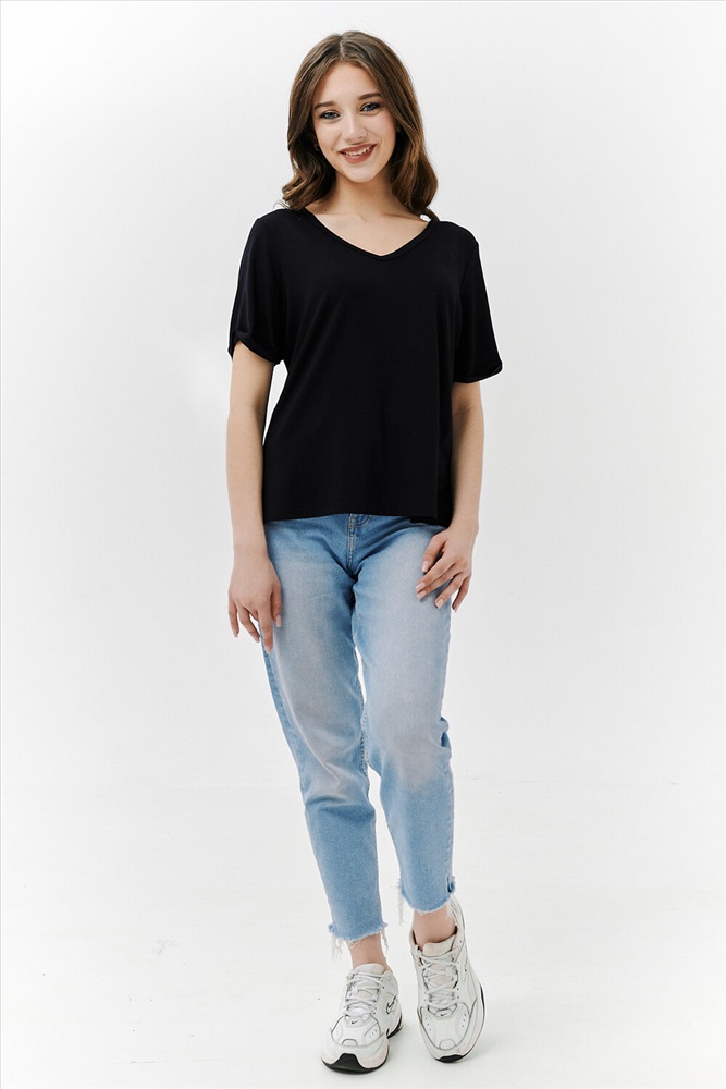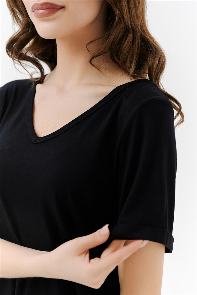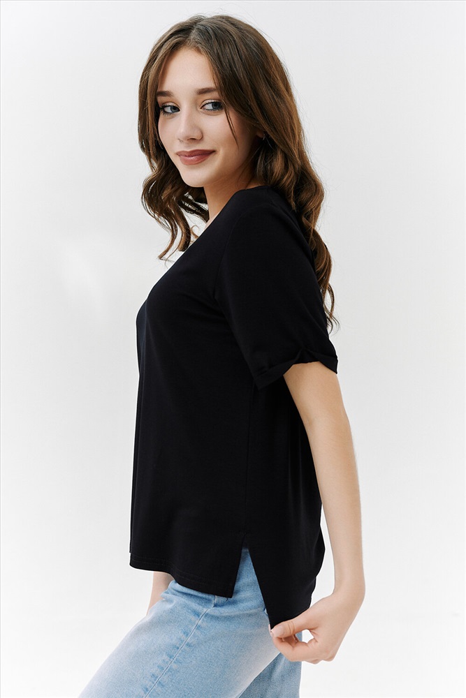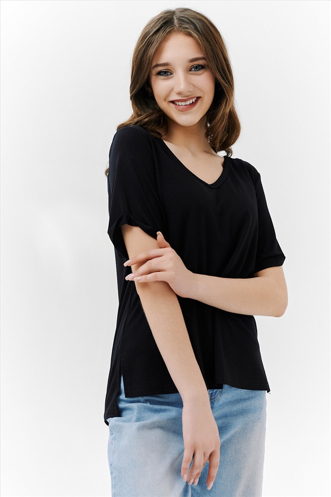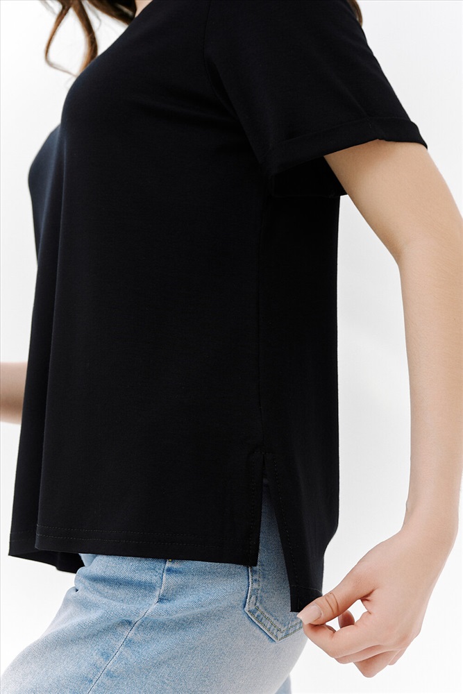 Футболка прямого силуэта, с V-образной горловиной, с разрезами в нижней части боковых швов. Спинка с кокеткой, удлиненная. Горловина обработана бейкой из основного полотна.