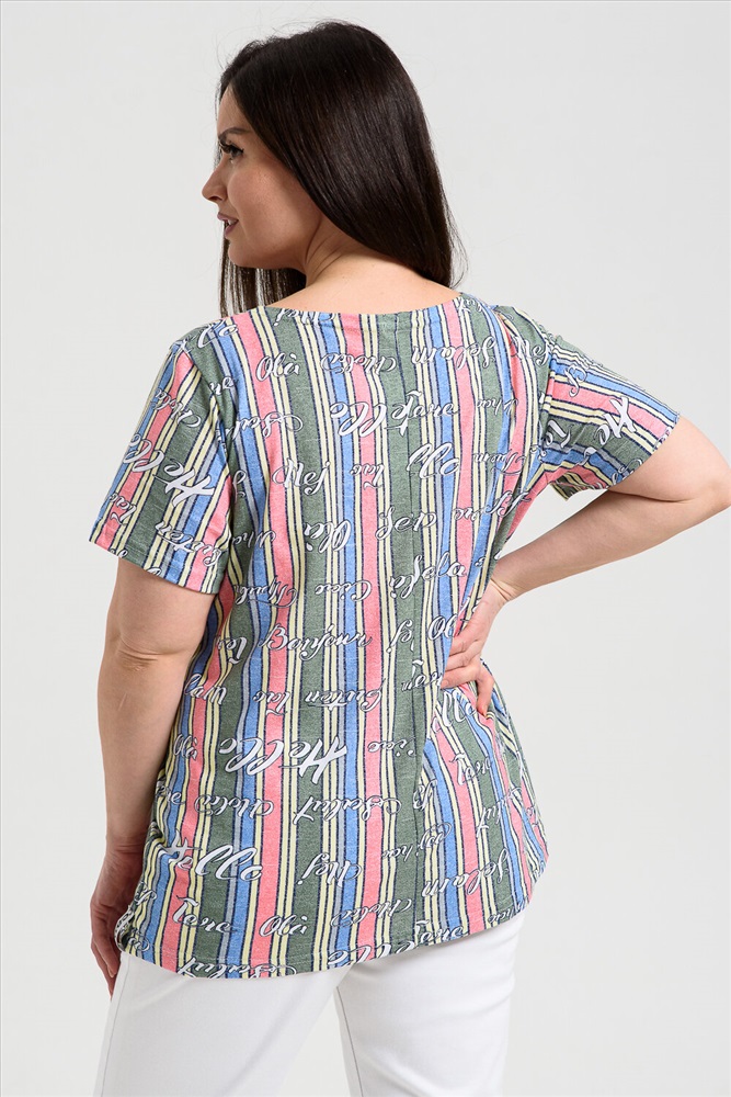 Футболка женская полуприлегающего силуэта. Рукав втачной короткий. Вырез горловины круглый. В боковом шве утяжки из декоративной тесьмы.