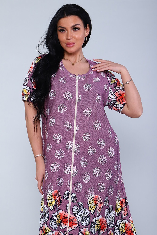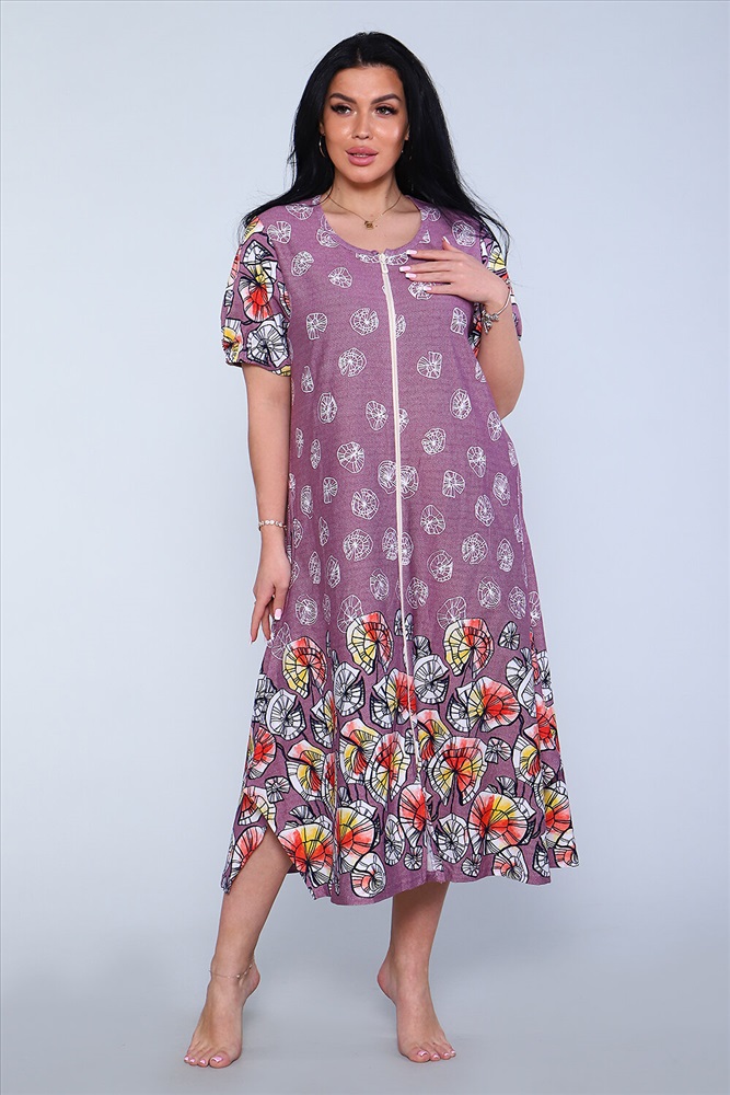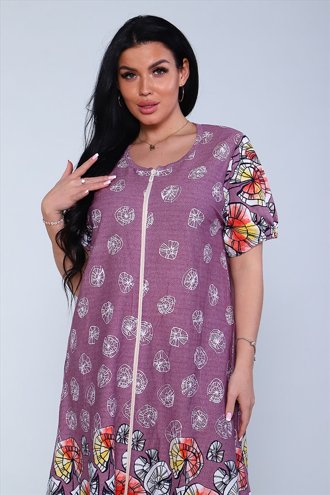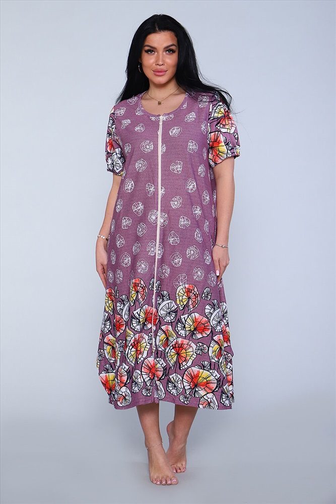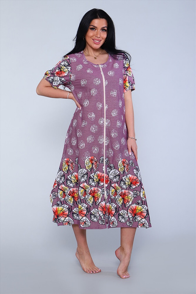 Халат женский, свободного кроя. На полочке халата в боковых швах расположены карманы. На рукавах посередине низка в подгибке втачена резинка, которая придает небольшую пышность рукаву. Изделие А-образного силуэта с хорошим расширением к низу, отлично садится на женщин с широкими бедрами. Халатик хорошо подходит для дома и отдыха на даче.