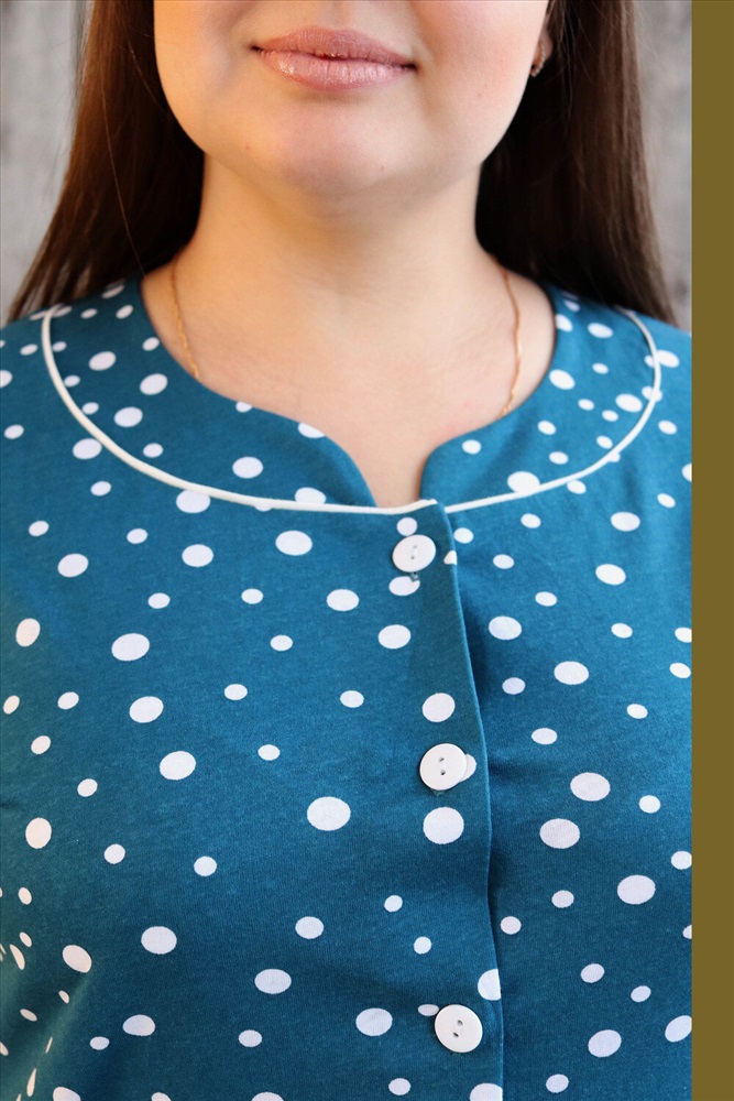 Халат на пуговицах со спущенной проймой, горловина и короткий рукав отделаны кантом, как и вход в боковой карман. Средней длины ниже колена. На модели размер 52